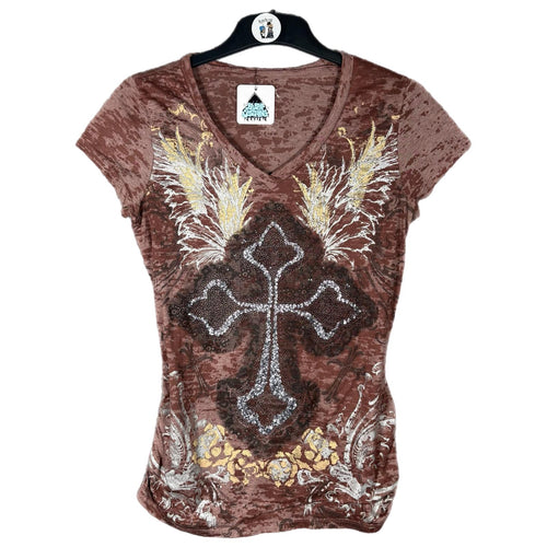 Rock 47 by Wrangler Y2K Mcbling Sequin Cross Brown Burnout Top Size Small