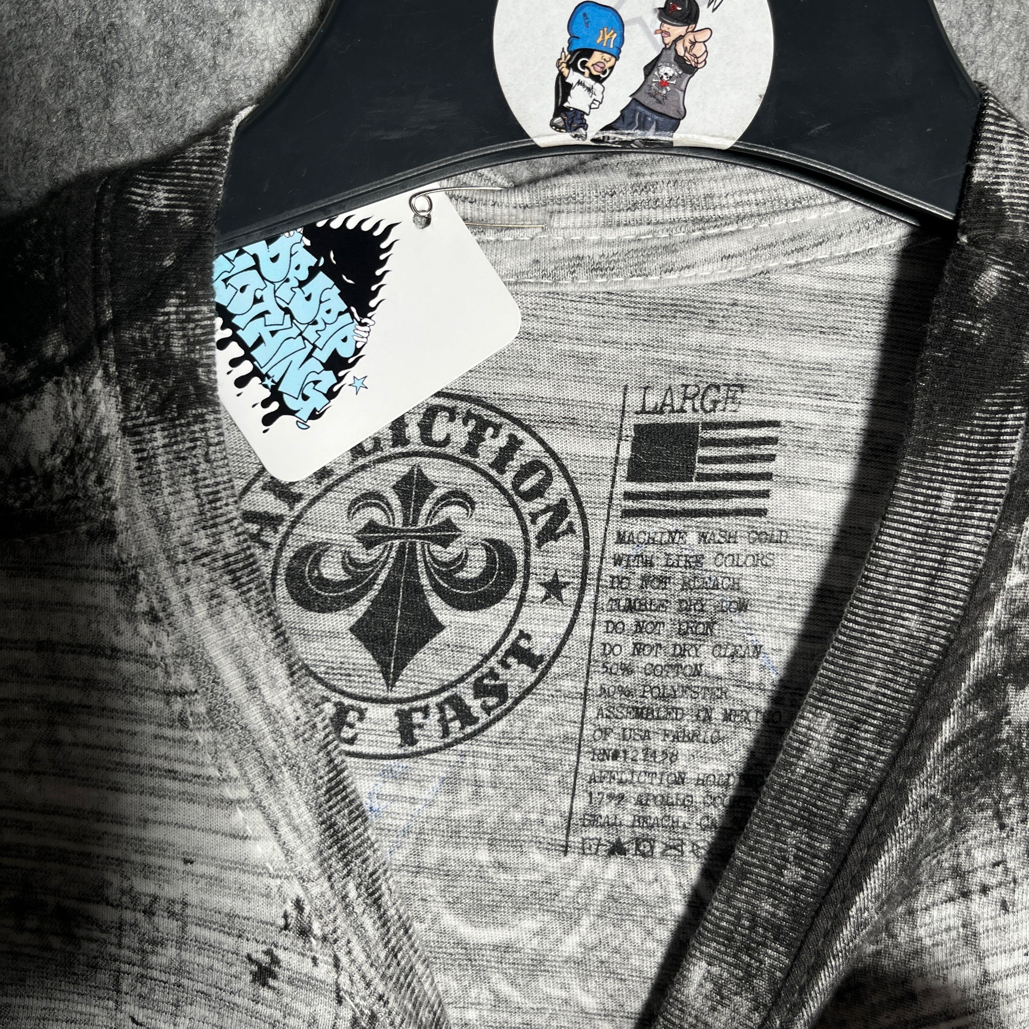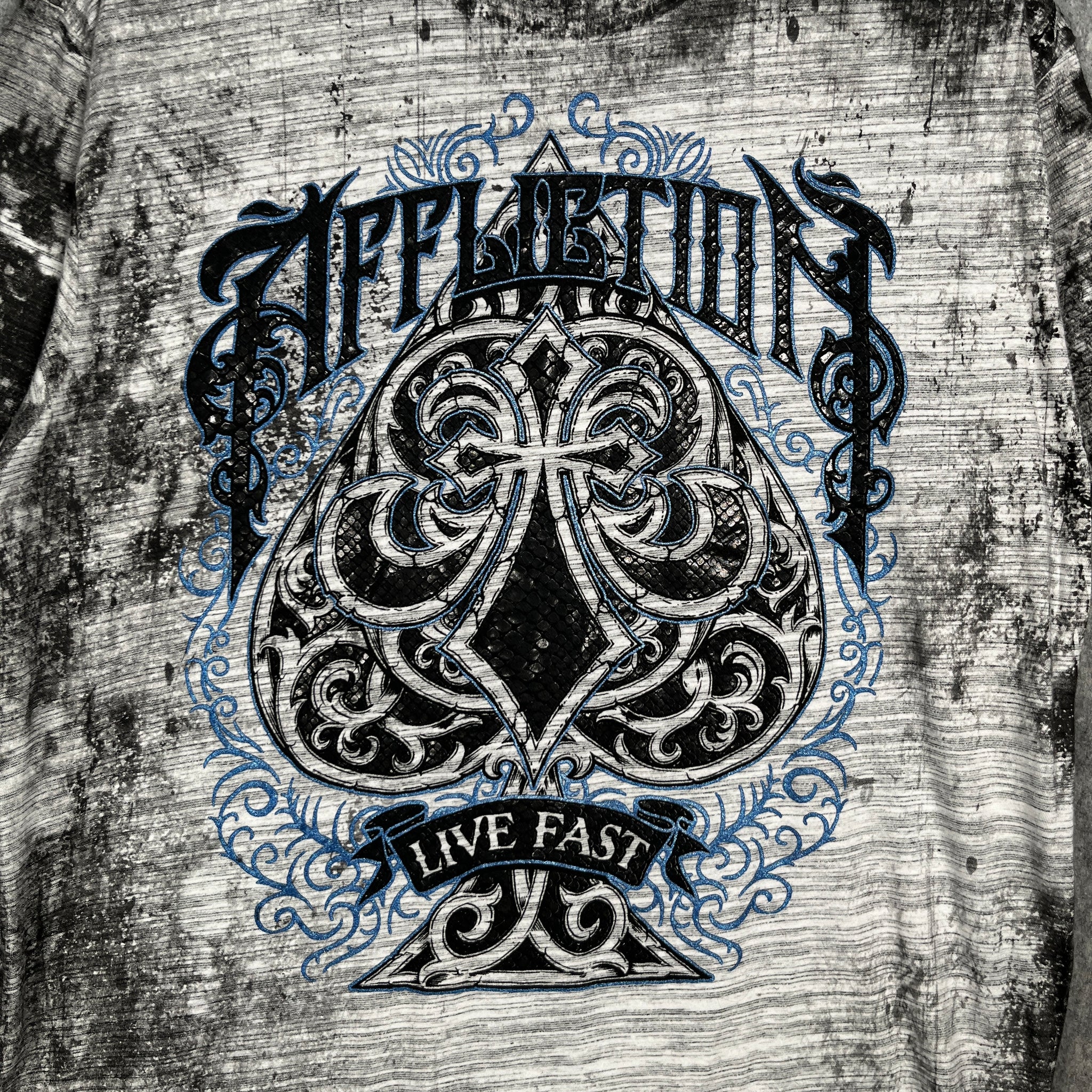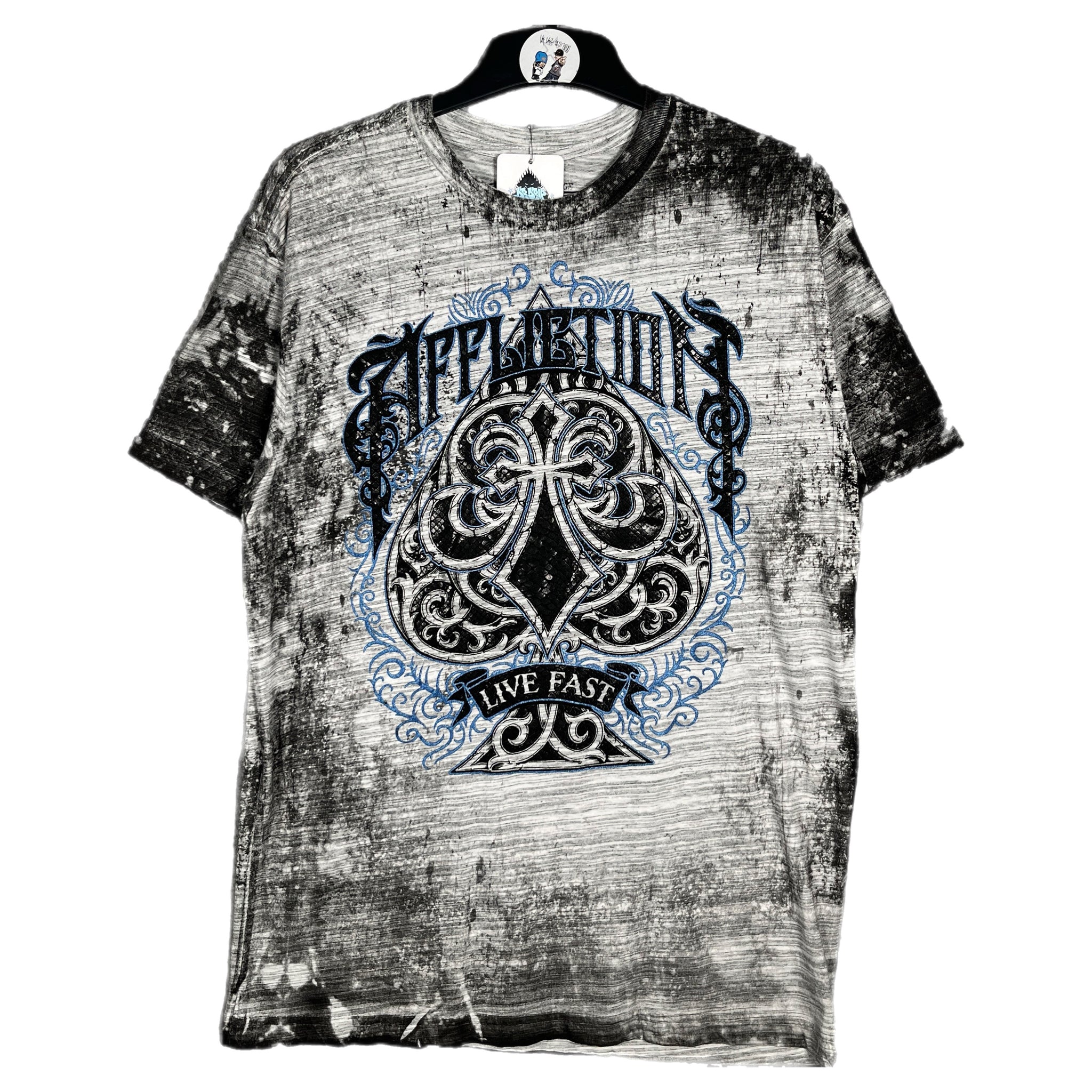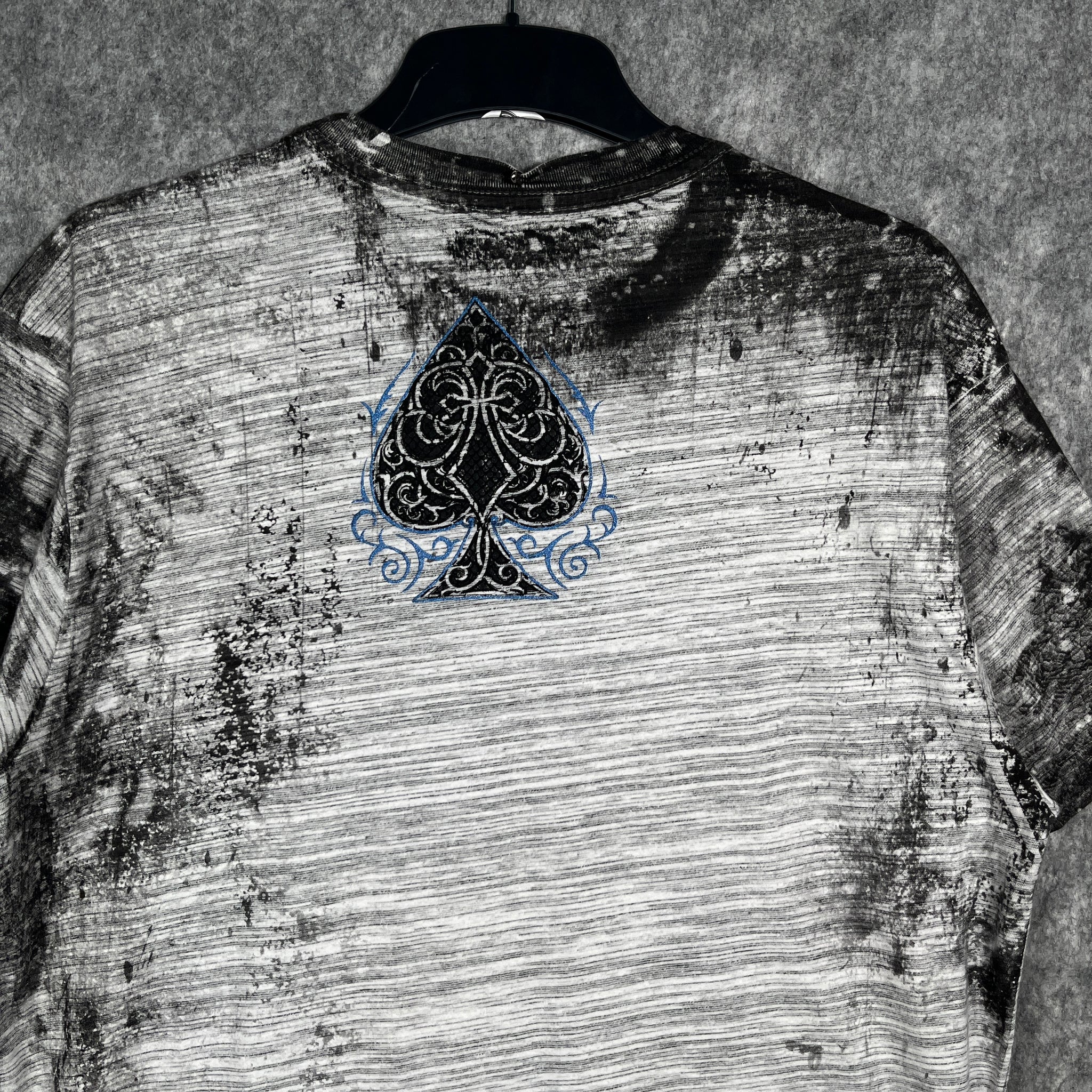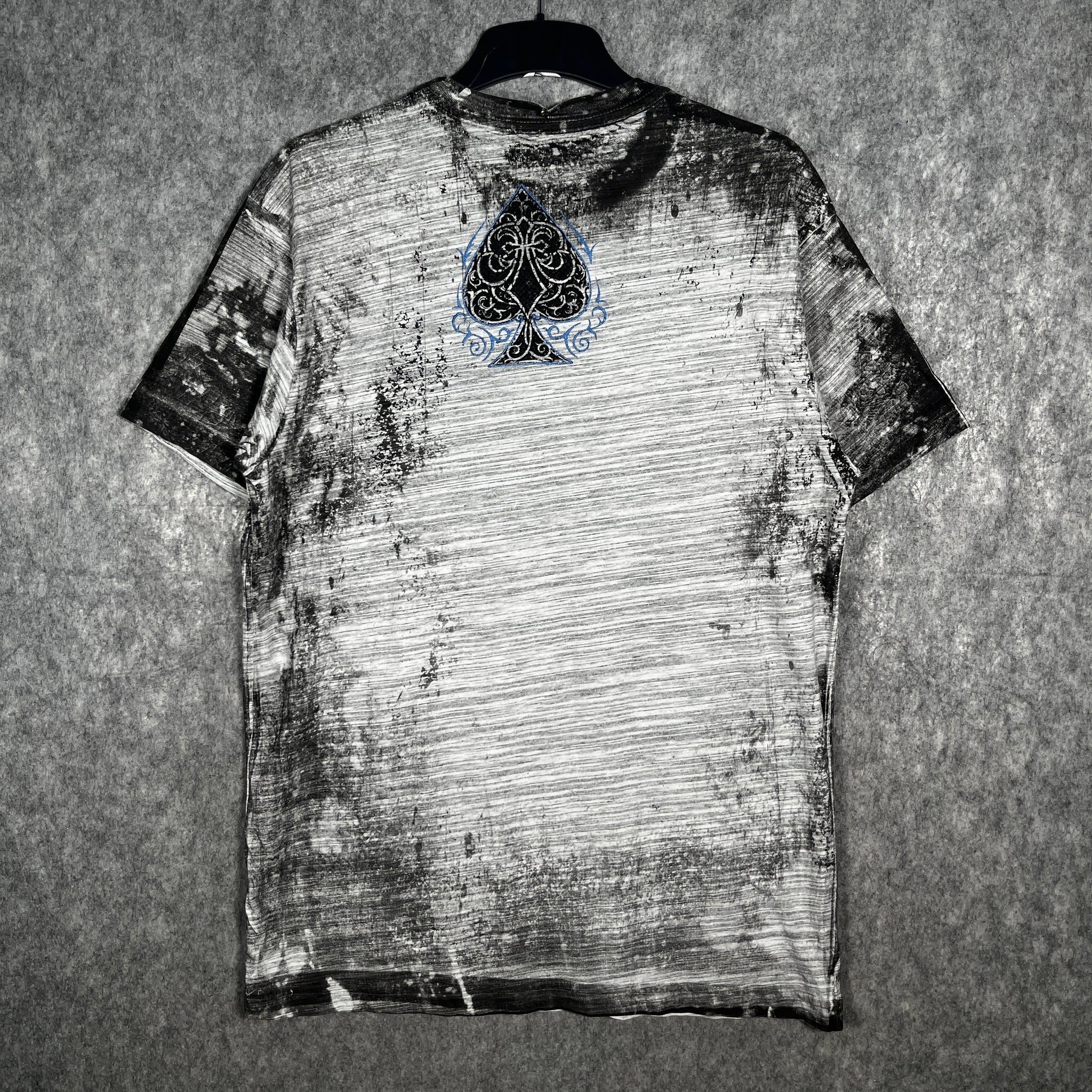 Statement Affliction T-shirt featuring an ornate spade graphic with layered gothic detailing and “Live Fast” banner text. Finished in a high-contrast black, grey, and white acid-wash effect, giving the tee a distressed, marbled appearance that’s instantly recognisable from Affliction’s golden-era Y2K output.