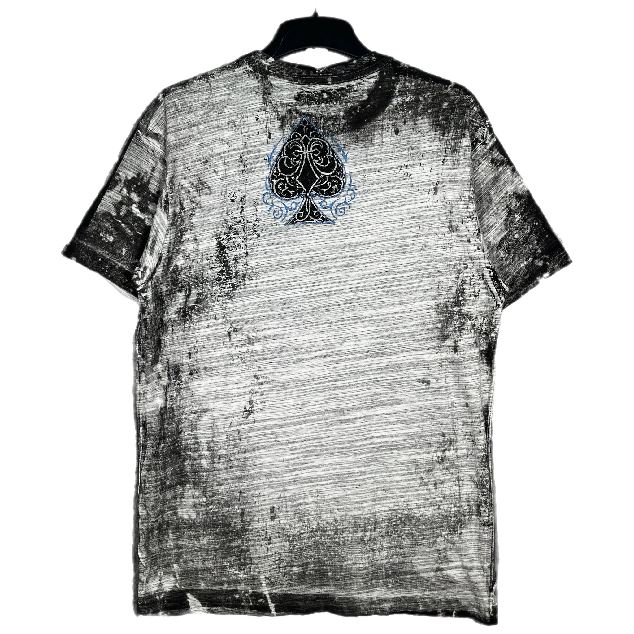 Bold front graphic is balanced by a smaller spade hit at the upper back, keeping the piece visually strong from all angles. A proper early-2000s gothic / biker crossover tee with that unmistakable Affliction look.