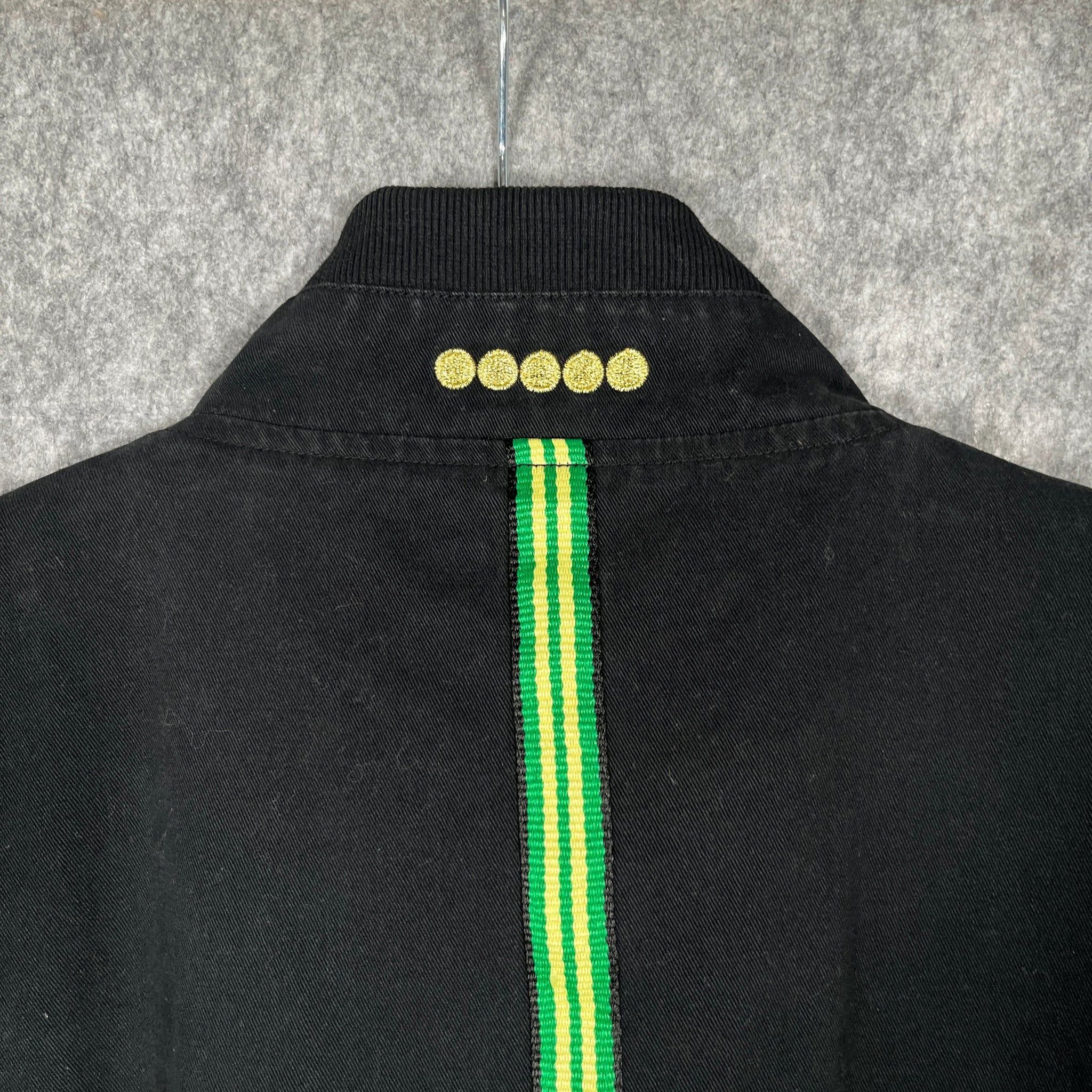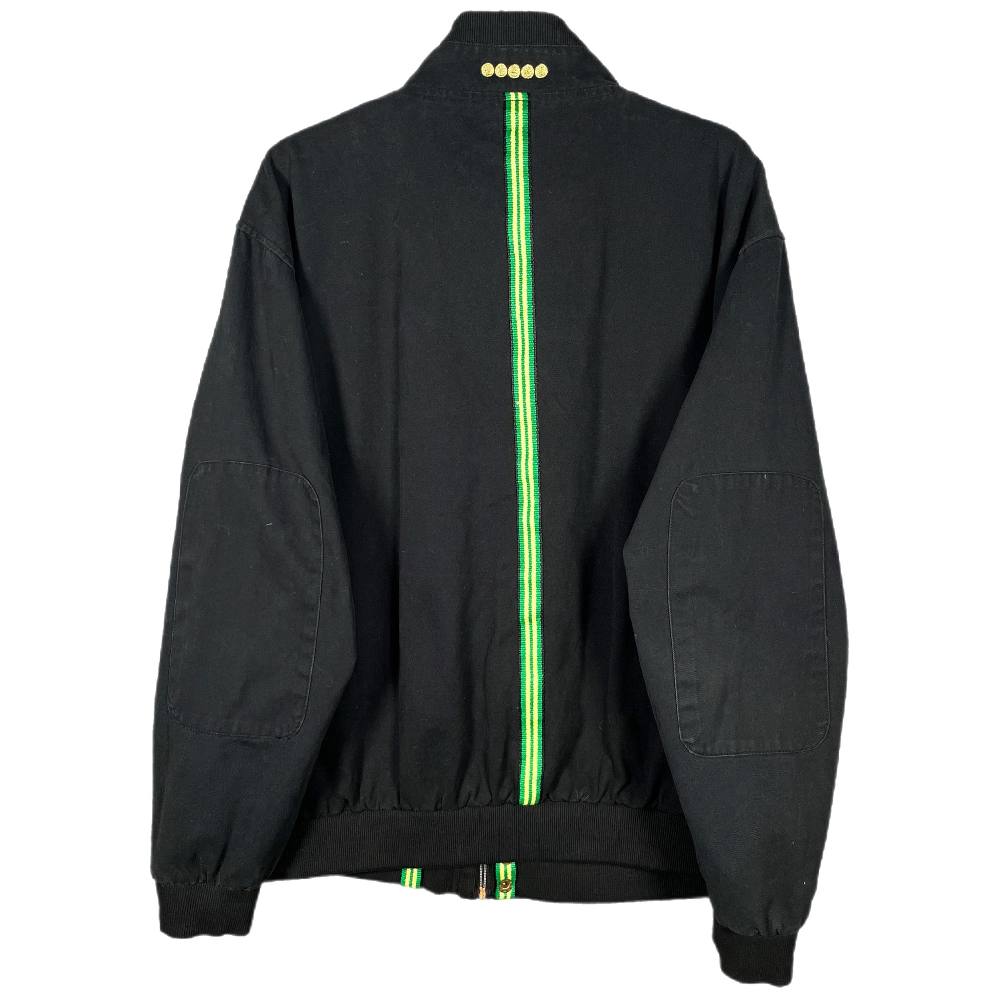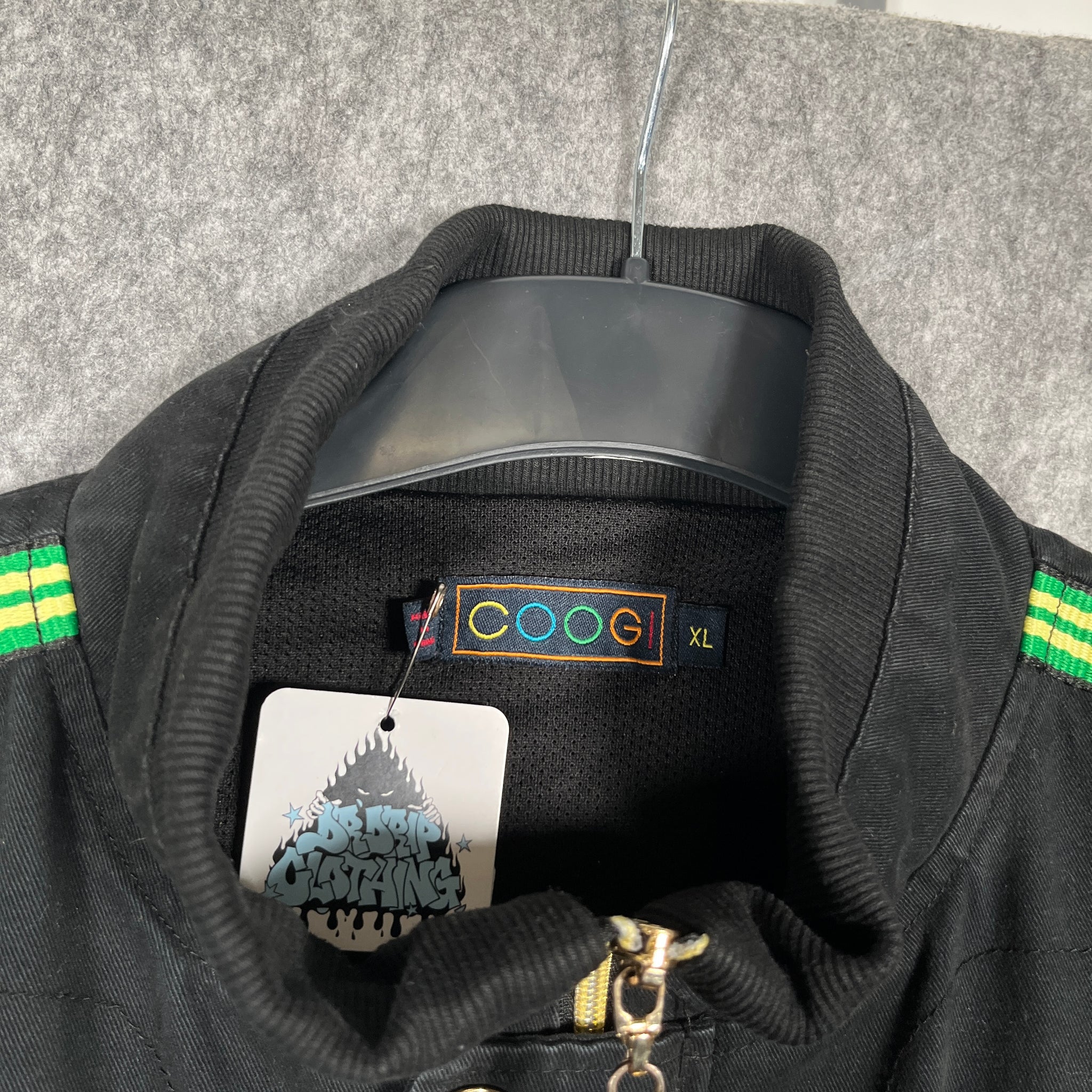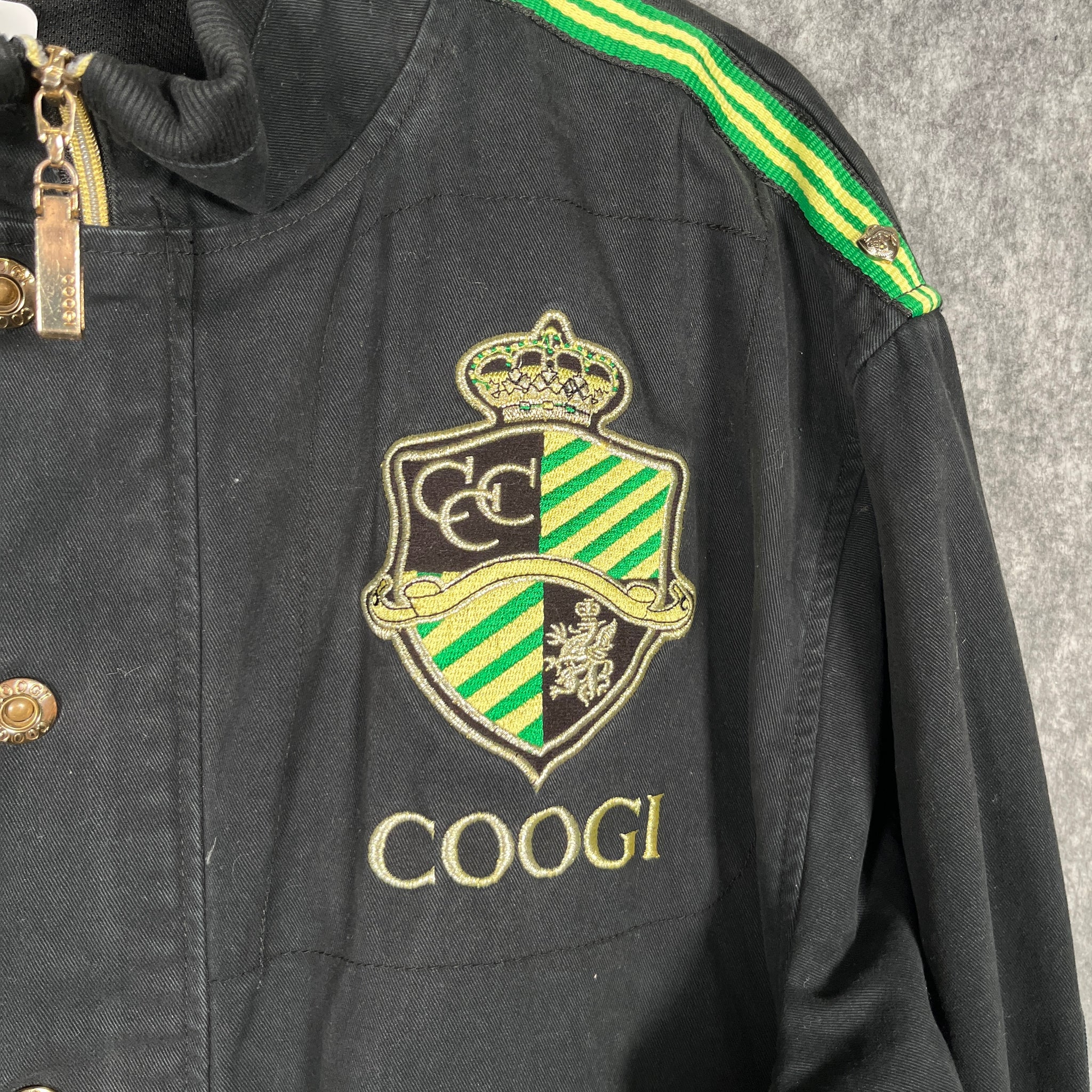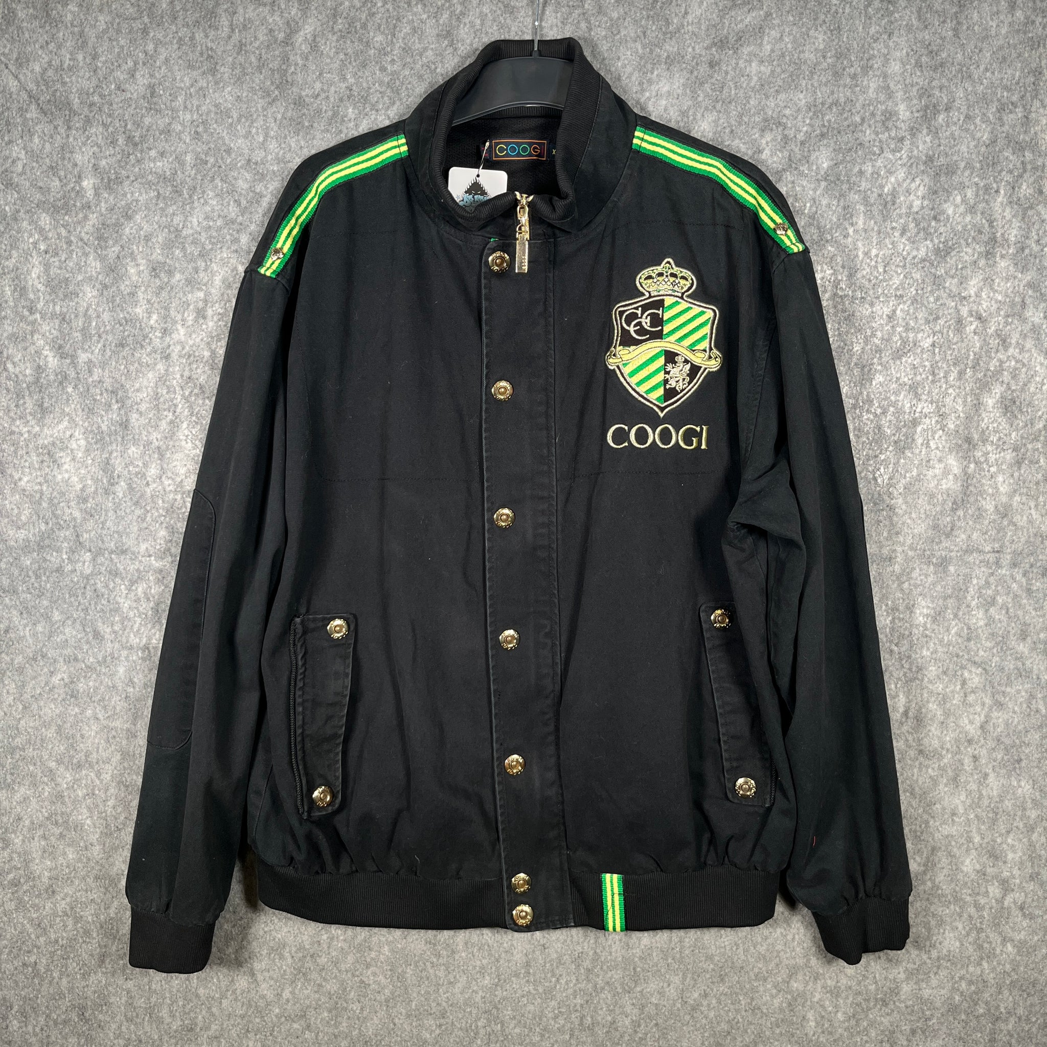 Vintage Coogi bomber jacket featuring an embroidered crest logo to the chest with bold green stripe detailing across the shoulders and down the back. Clean black body with gold-tone snap buttons and a concealed zip fastening. A heavy, structured jacket with strong Y2K hip-hop energy and premium detailing throughout.
