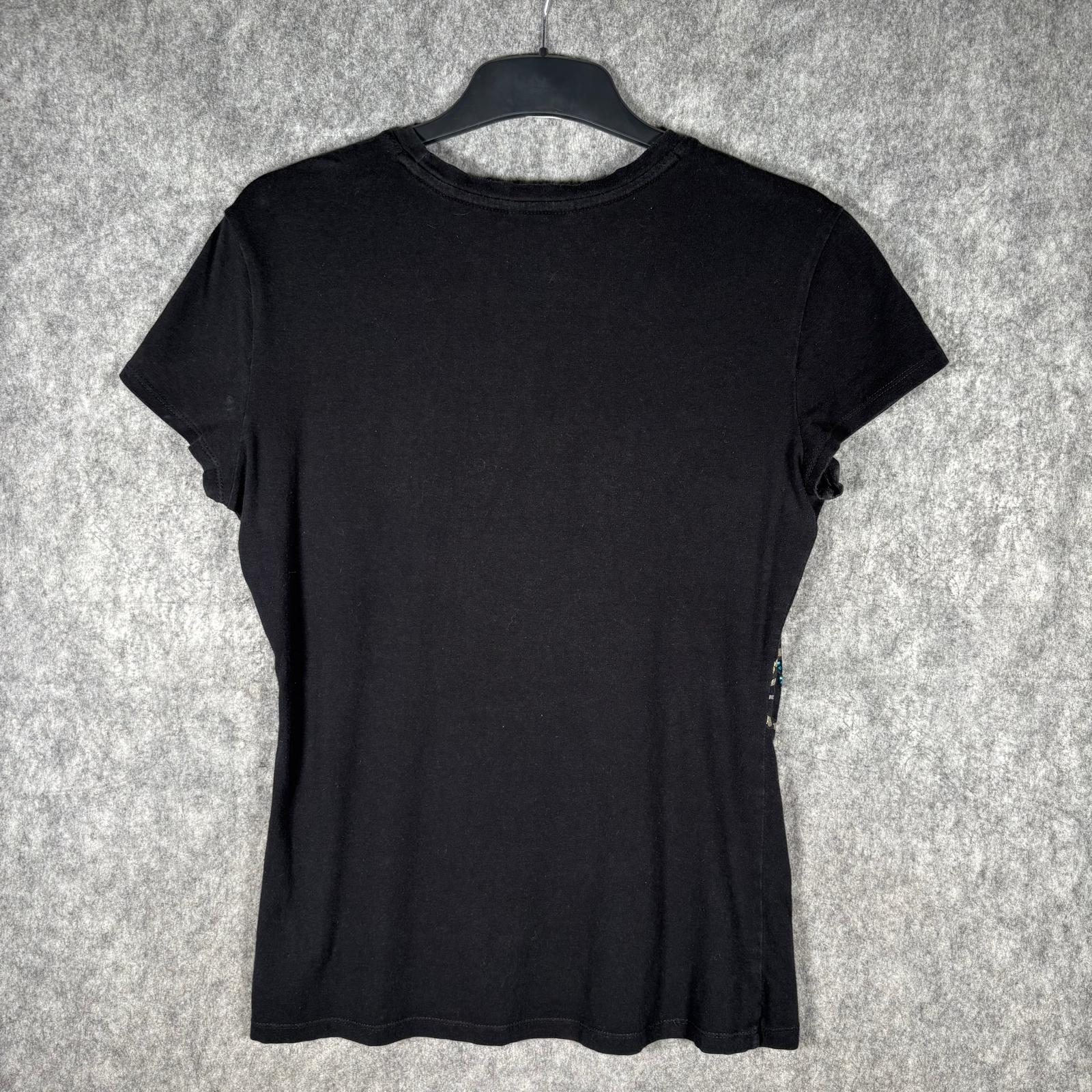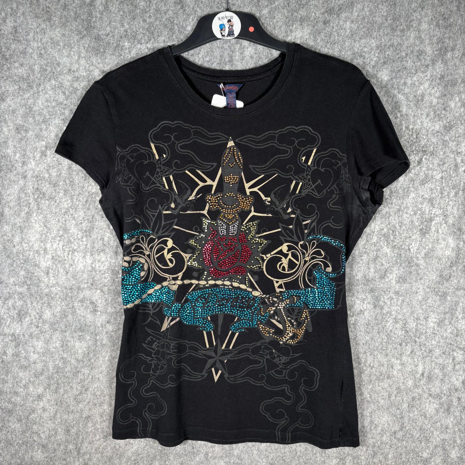 Vintage Dereon (Beyoncé’s original fashion line) graphic T-shirt featuring a bold studded front design with metallic detailing, classic early-2000s typography, and clean black base. Signature Y2K hip-hop style with fitted cut and rhinestone embellishments.