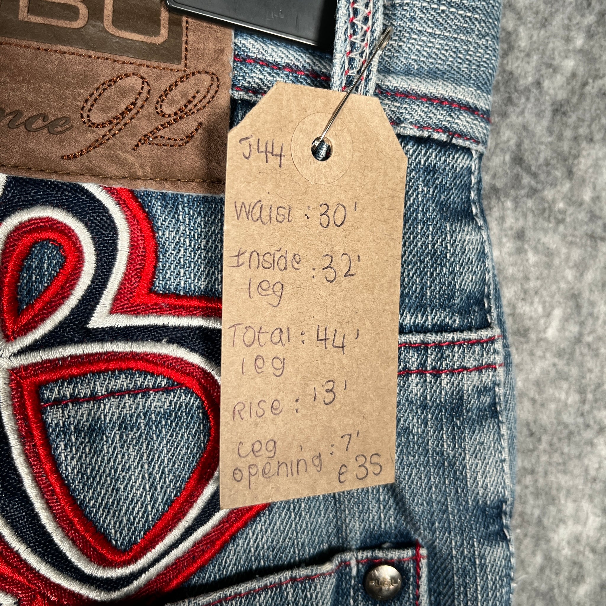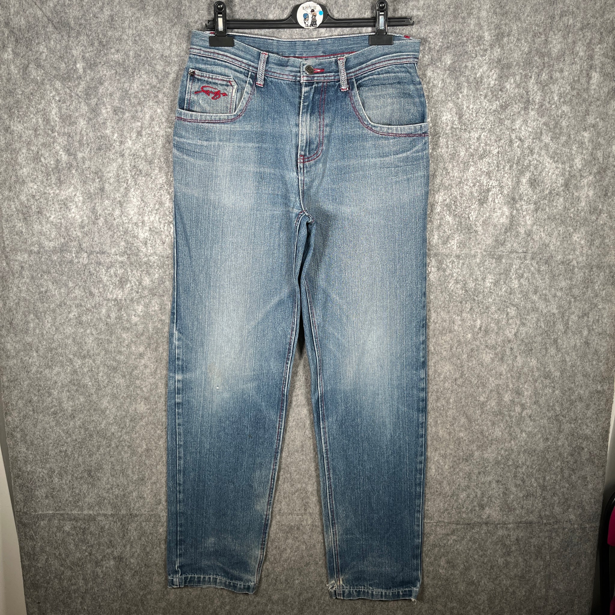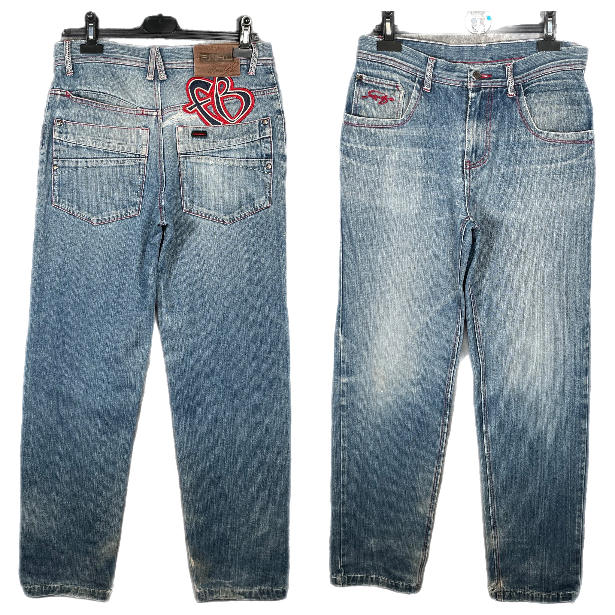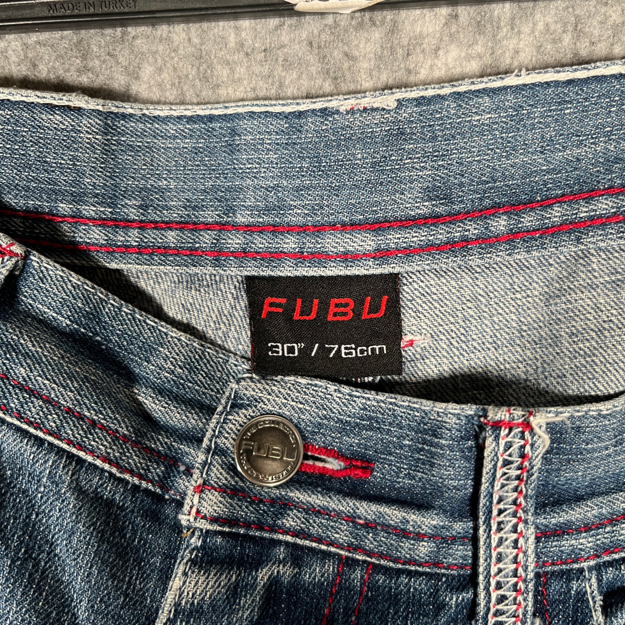 Vintage FUBU blue denim jeans featuring bold embroidered back pocket logo and contrast red stitching throughout. Classic early-2000s baggy silhouette with a structured heavyweight denim feel. Branded hardware, five-pocket construction, and strong Y2K hip-hop aesthetic typical of FUBU’s peak era.