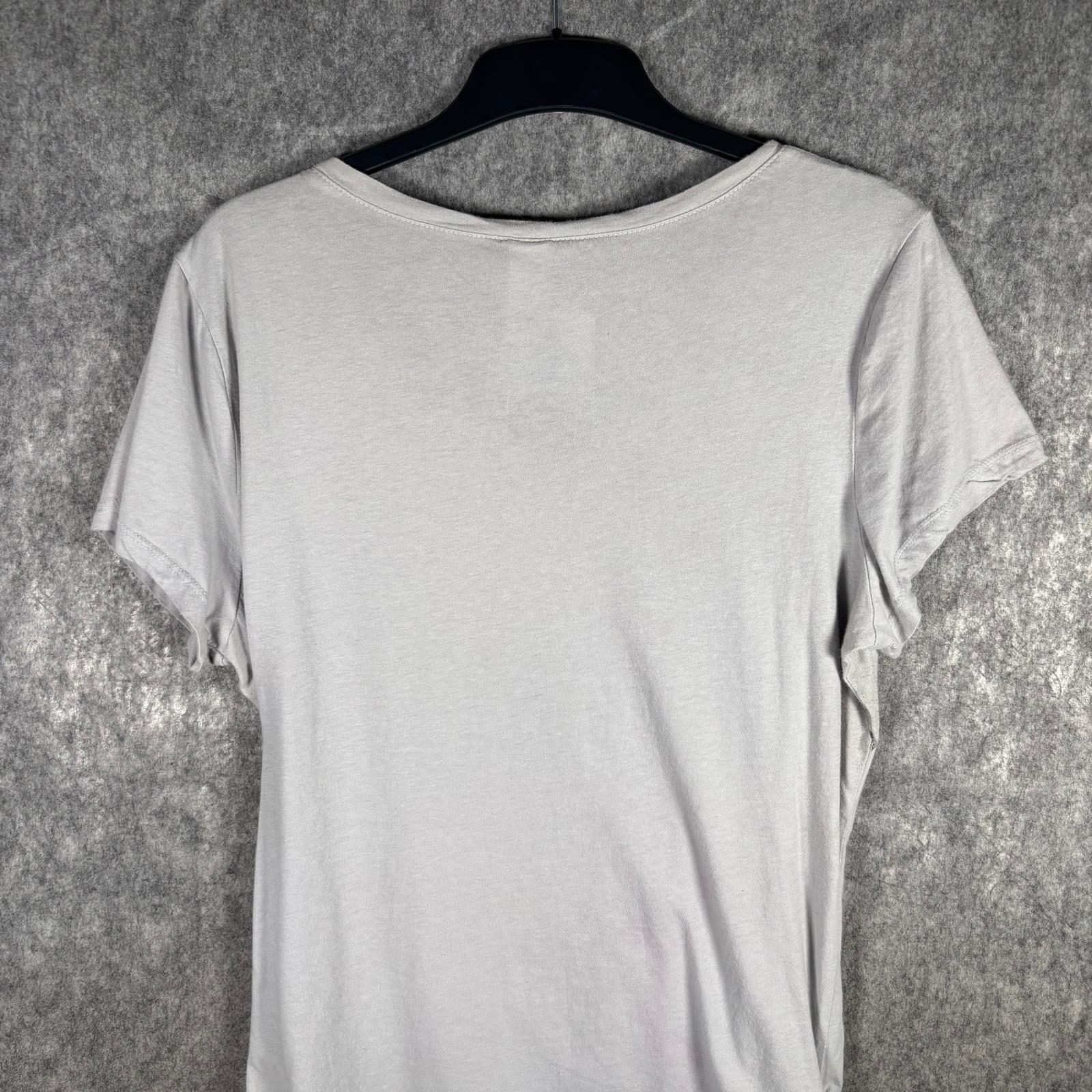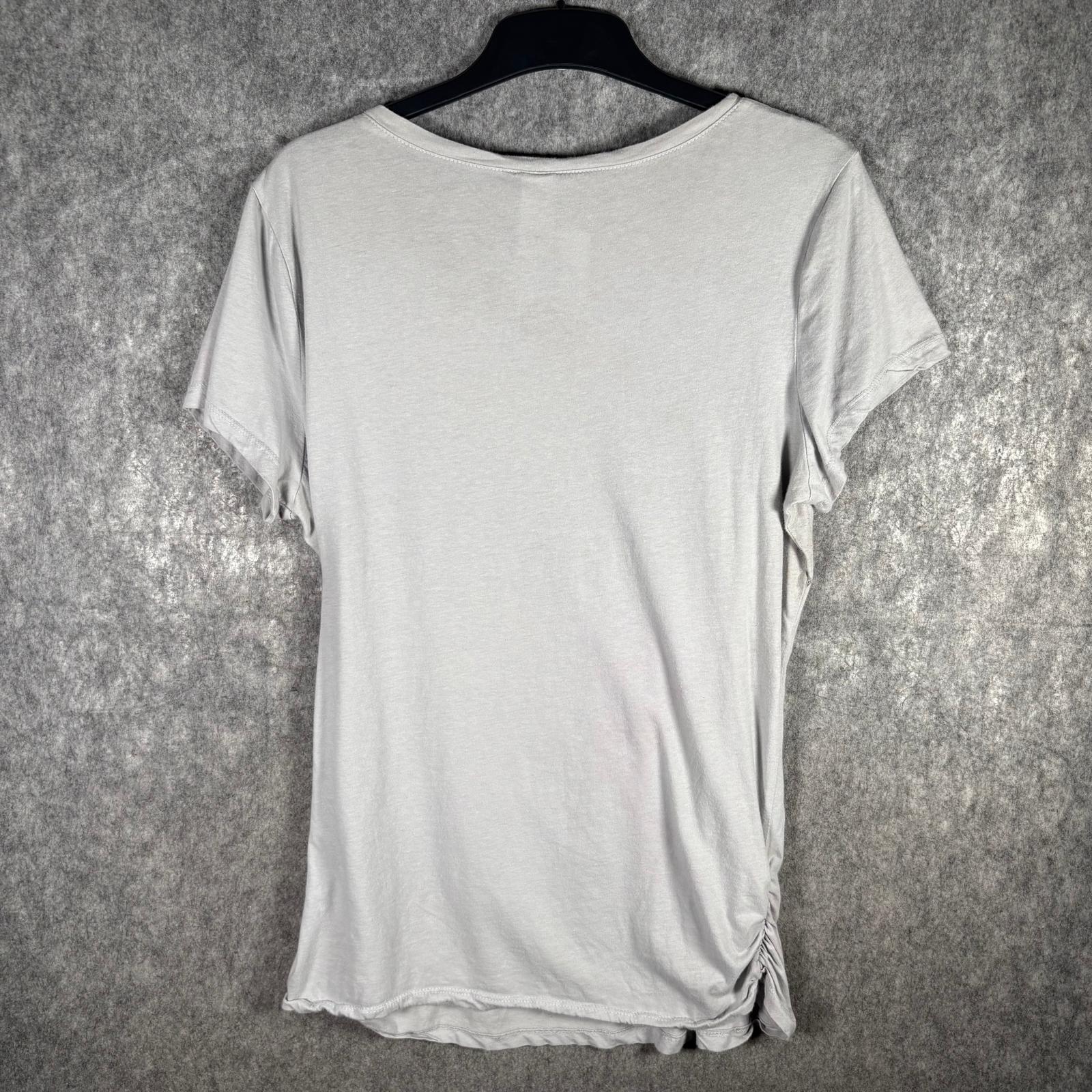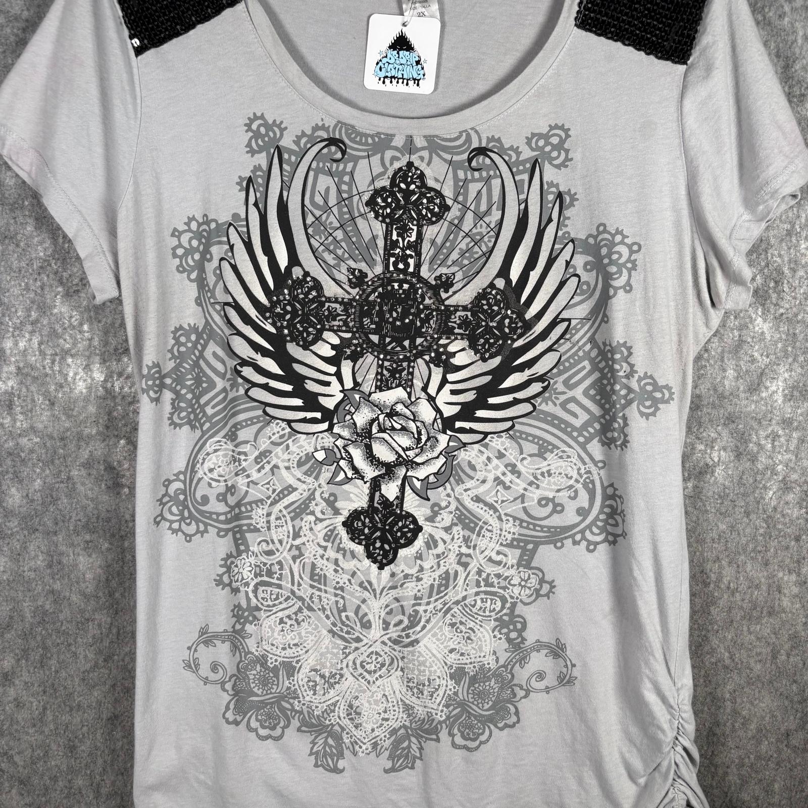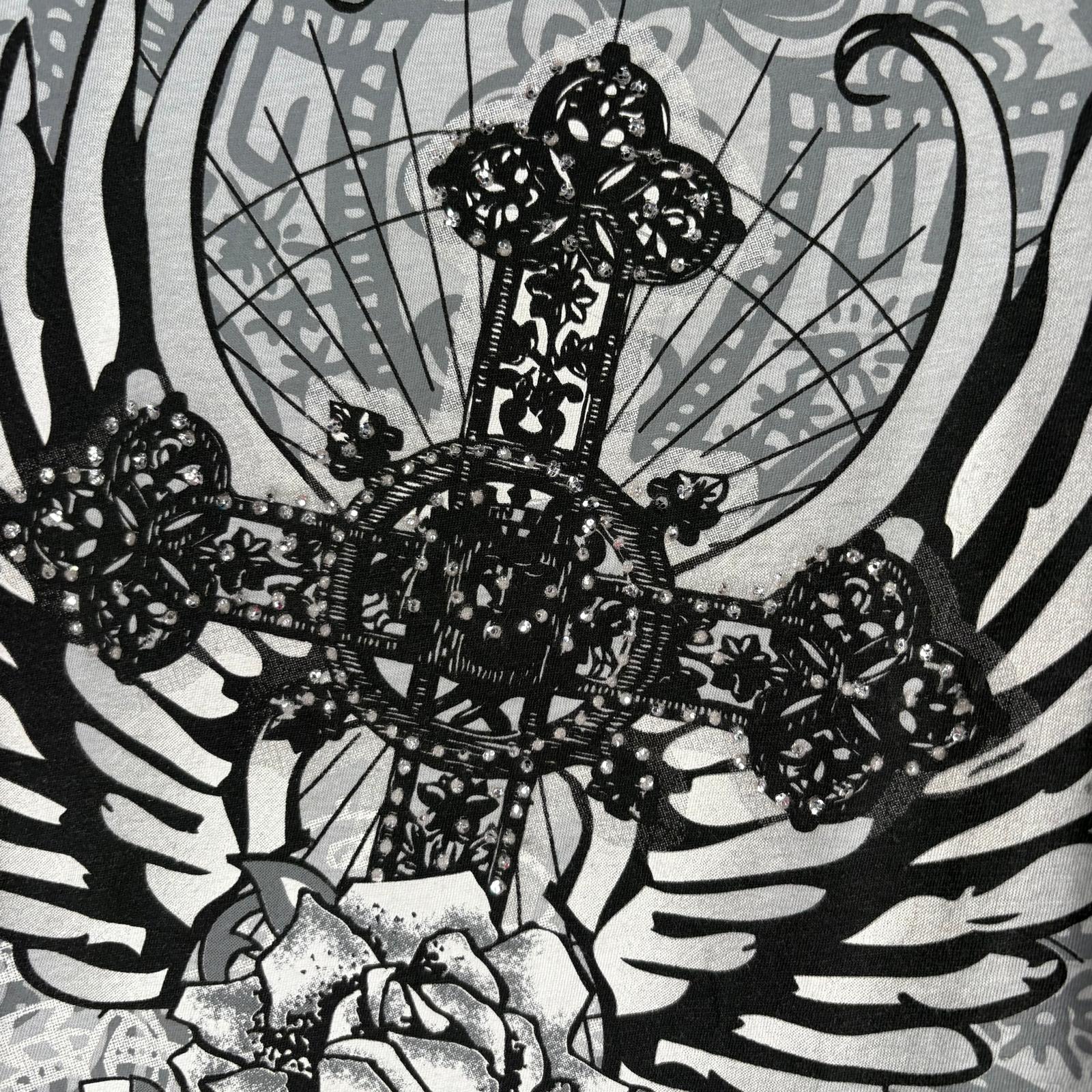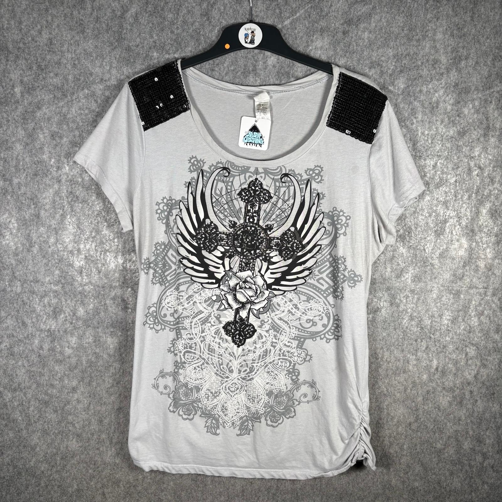 A bold and detailed graphic tee featuring a large winged cross design across the front. Finished with black sequin panels on the shoulders and ruched detailing on the side hem. Soft, lightweight fabric with a relaxed drape. Tag is missing, so the brand is unknown.