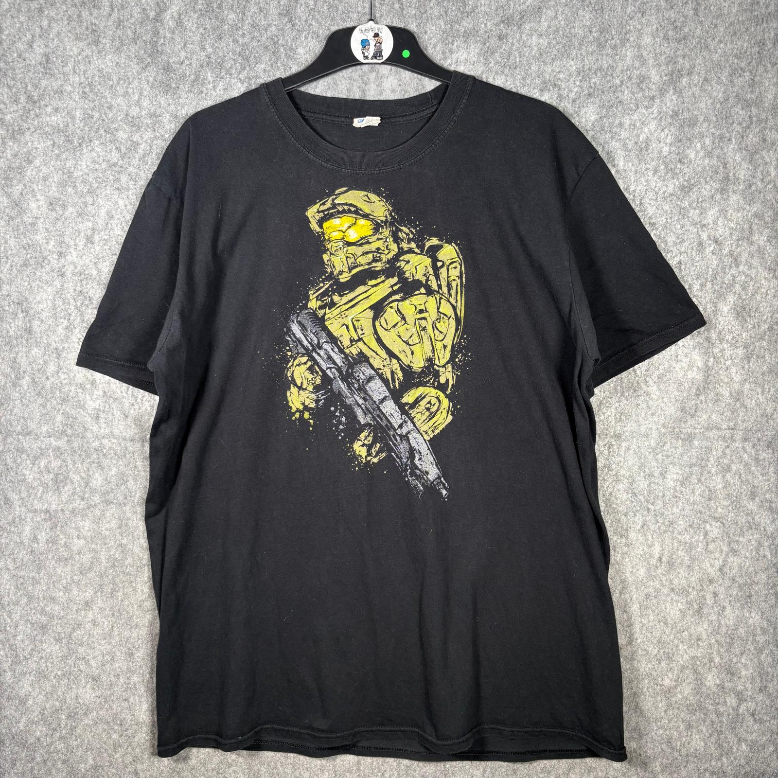Striking Halo tee featuring a bold yellow Master Chief graphic on black. Classic gamer nostalgia with a naturally worn fade that adds character. A great piece for fans of early Xbox culture and FPS gaming history.