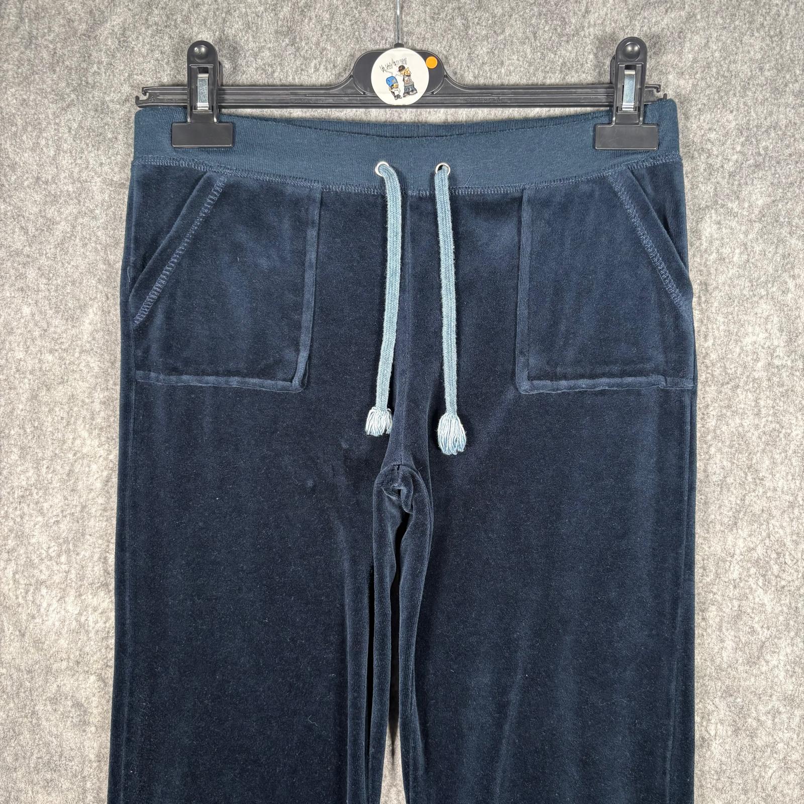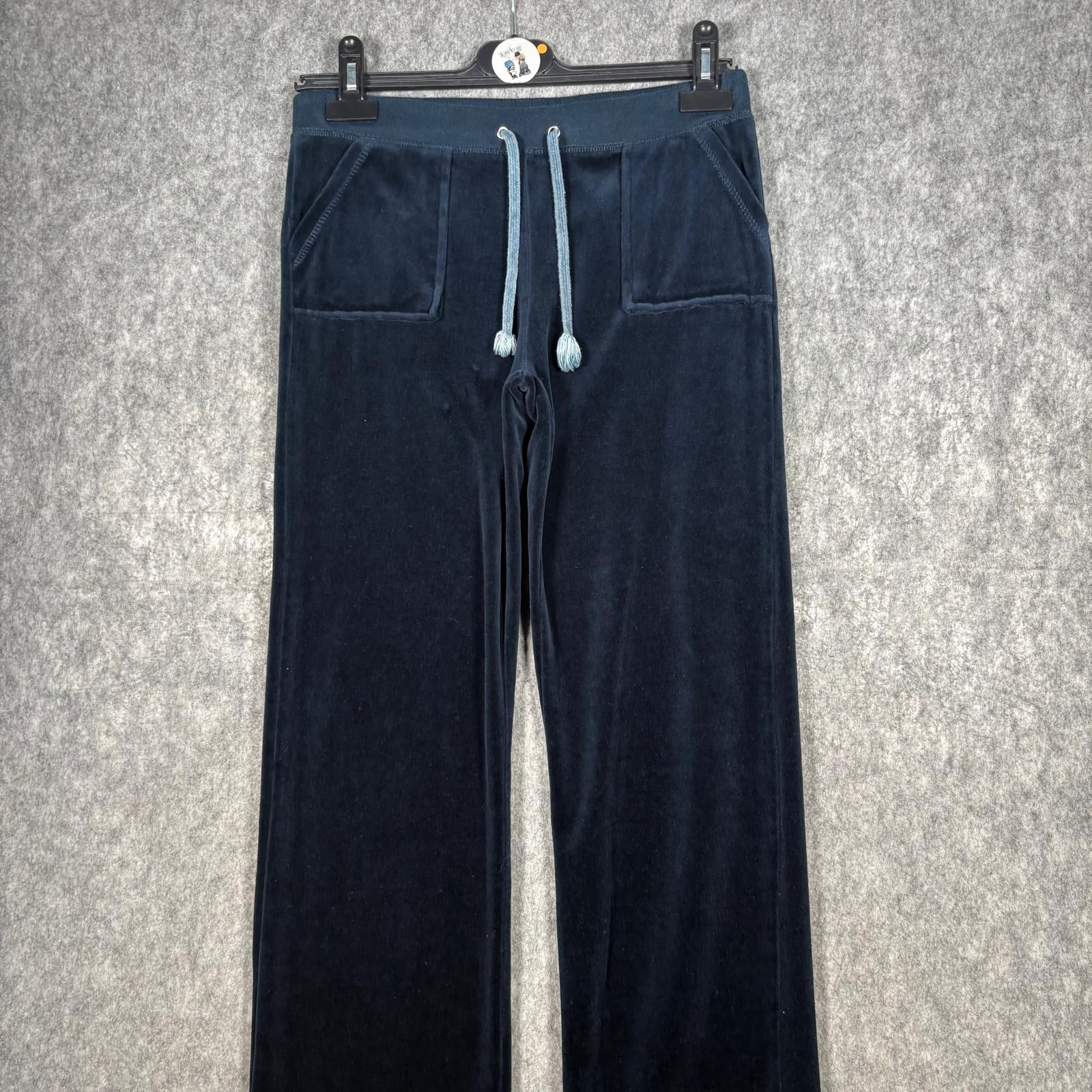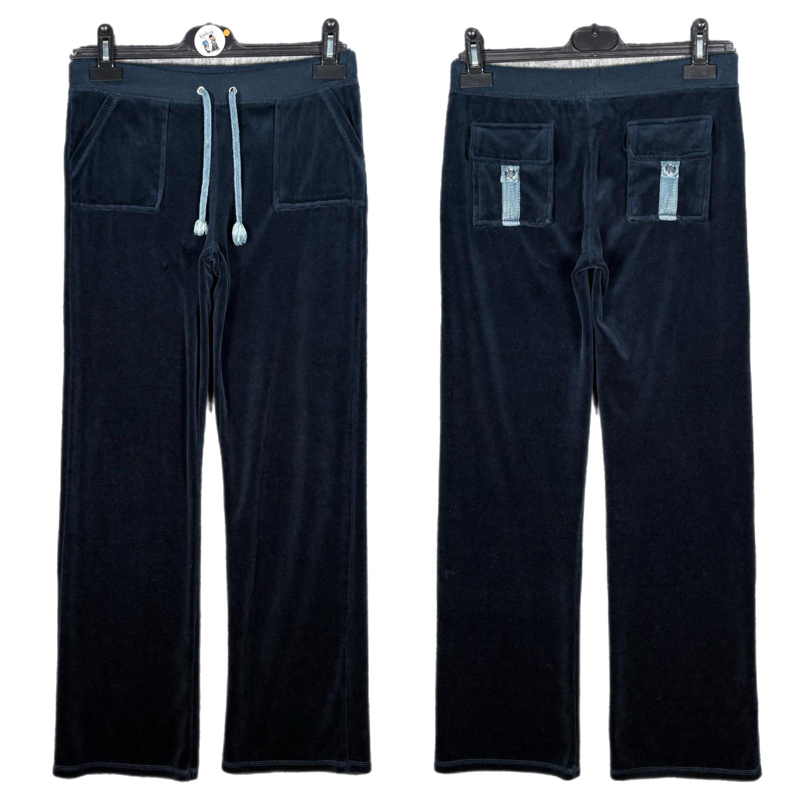 Vintage Juicy Couture velour joggers in a deep navy blue, classic low-rise Y2K silhouette with front pockets and signature rear button-tab pockets in light blue contrast. Soft velour, drawstring waist, and that iconic early-2000s Juicy look.