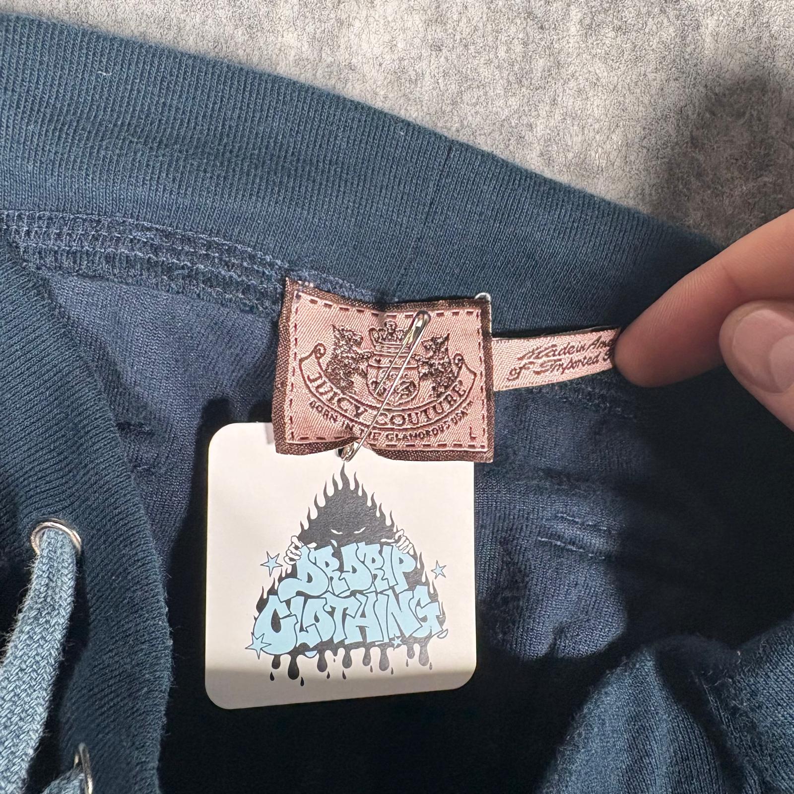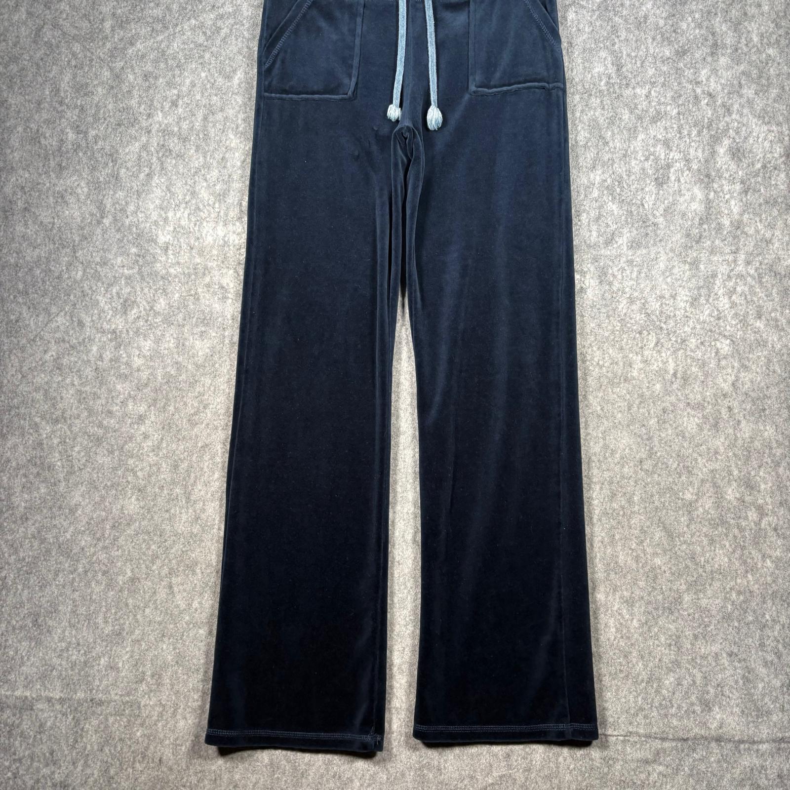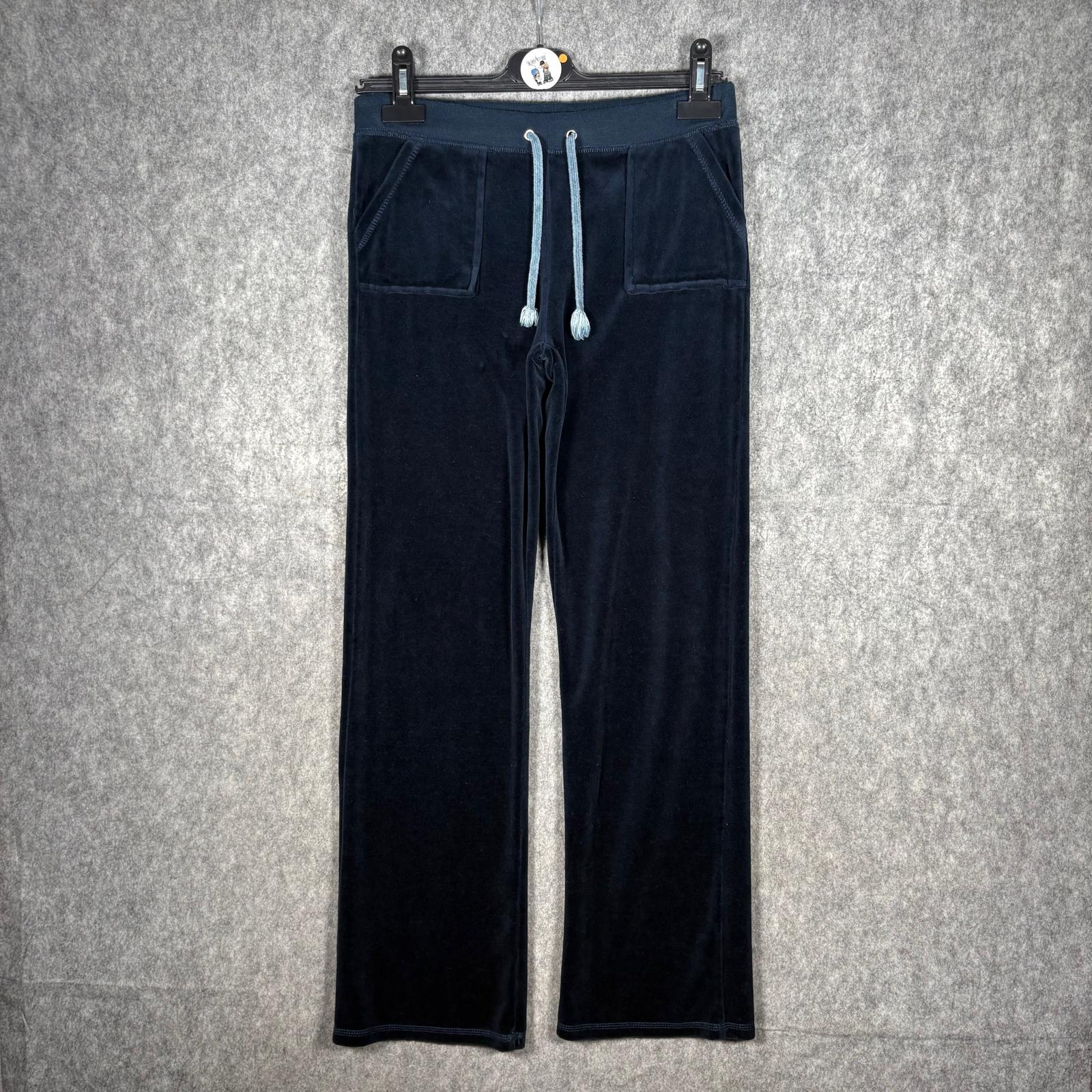 Vintage Juicy Couture velour joggers in a deep navy blue, classic low-rise Y2K silhouette with front pockets and signature rear button-tab pockets in light blue contrast. Soft velour, drawstring waist, and that iconic early-2000s Juicy look.