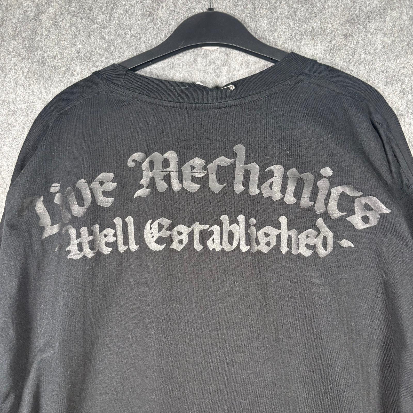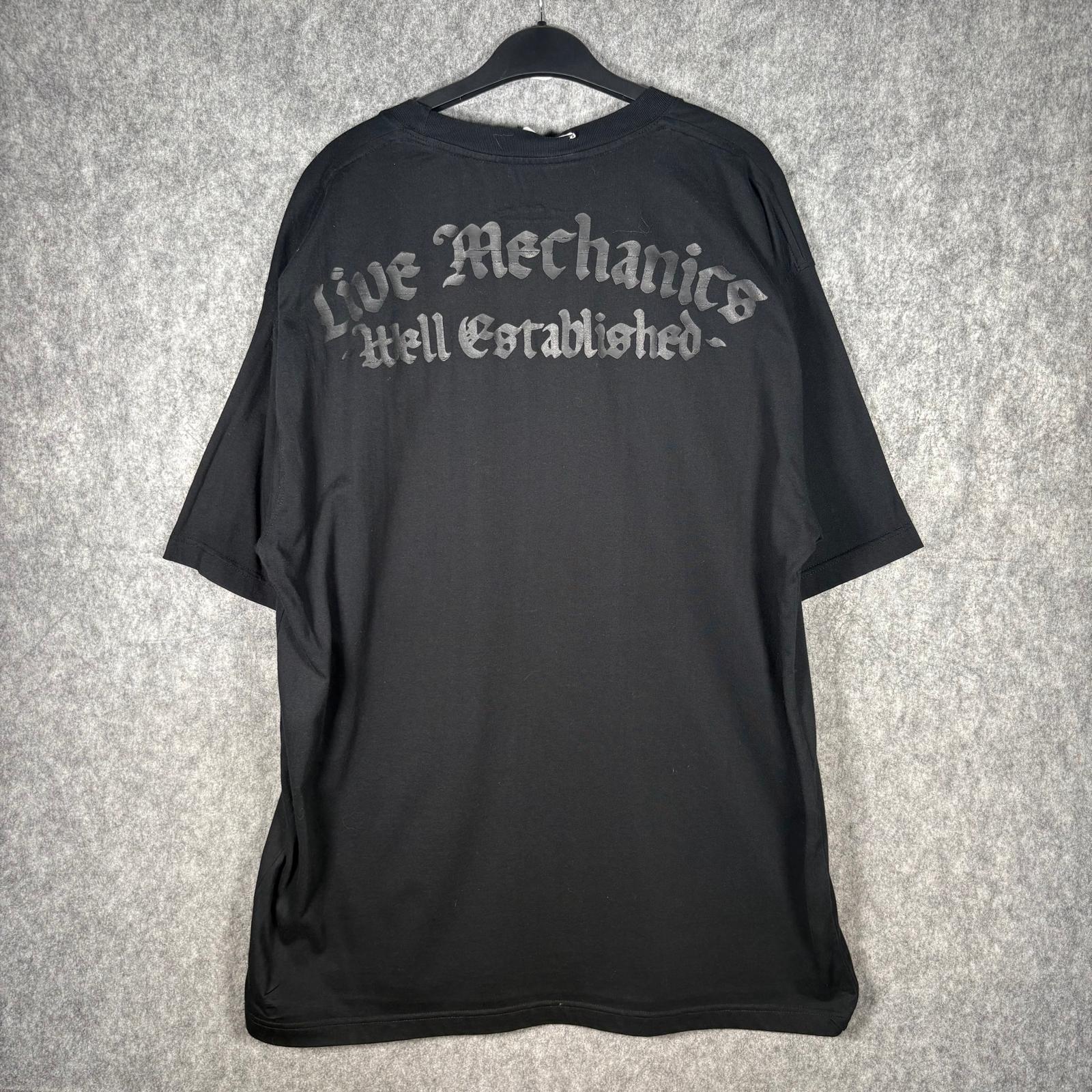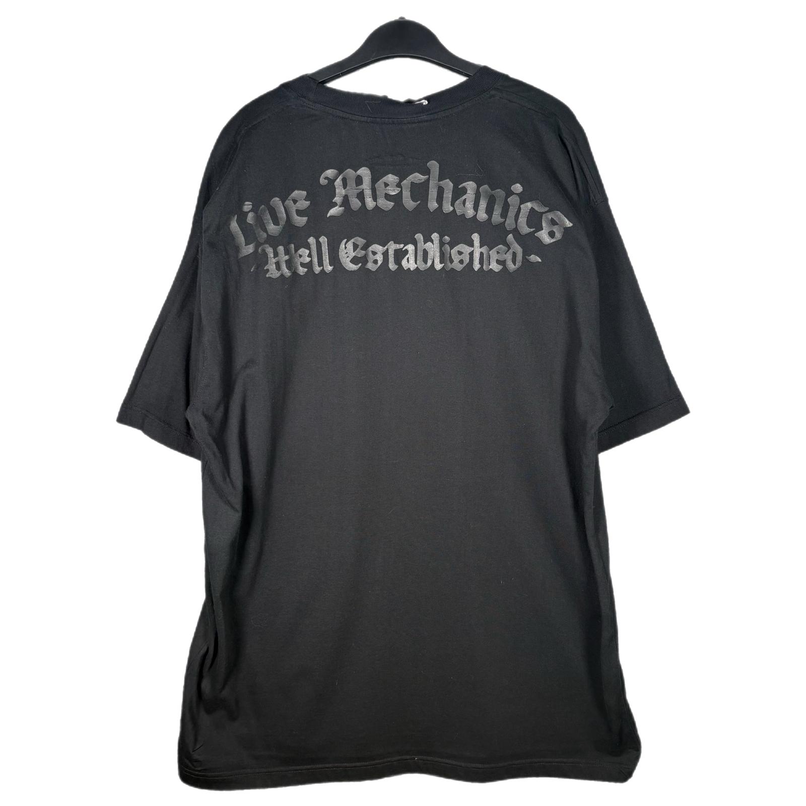 Live Mechanics “Well Established” crest graphic tee in classic black with a bold metallic-style front print and matching gothic script across the back. Premium 2000s streetwear with the classic oversized silhouette and detailed graphic texture.
