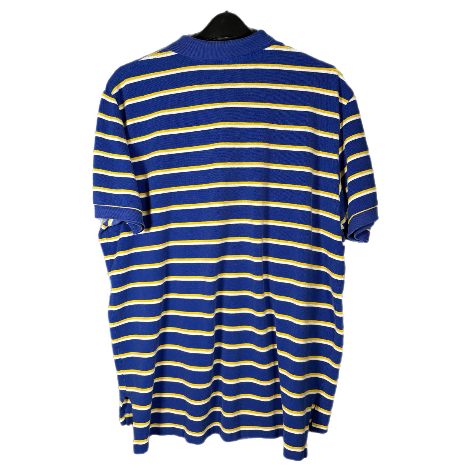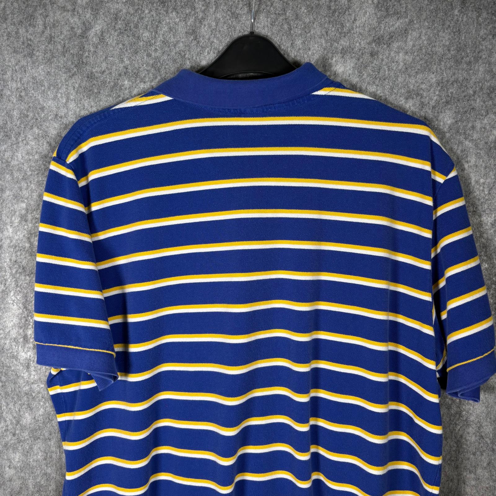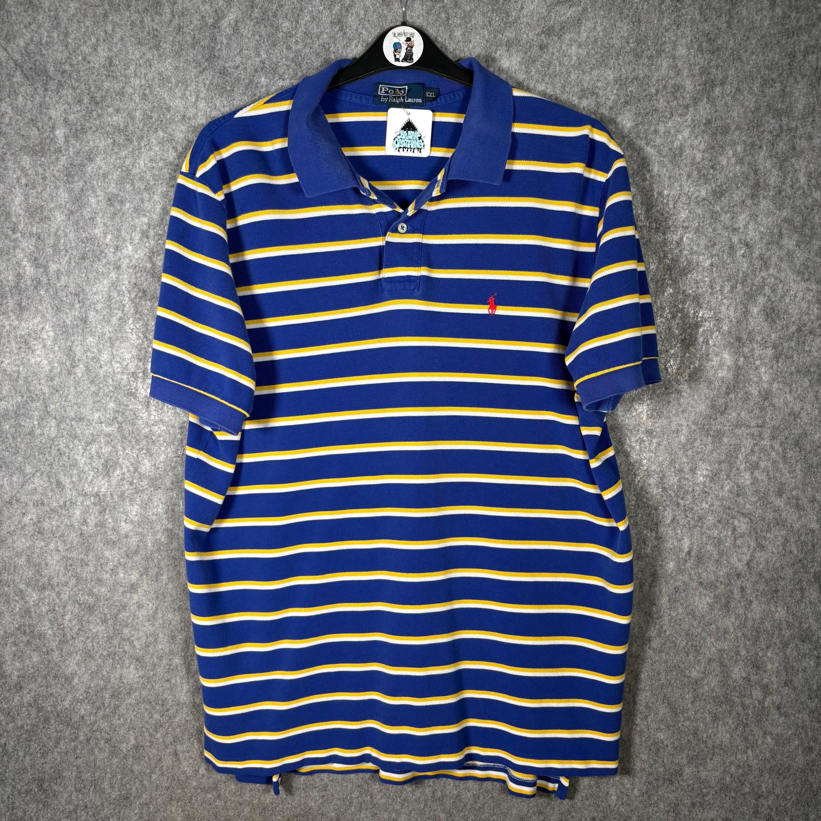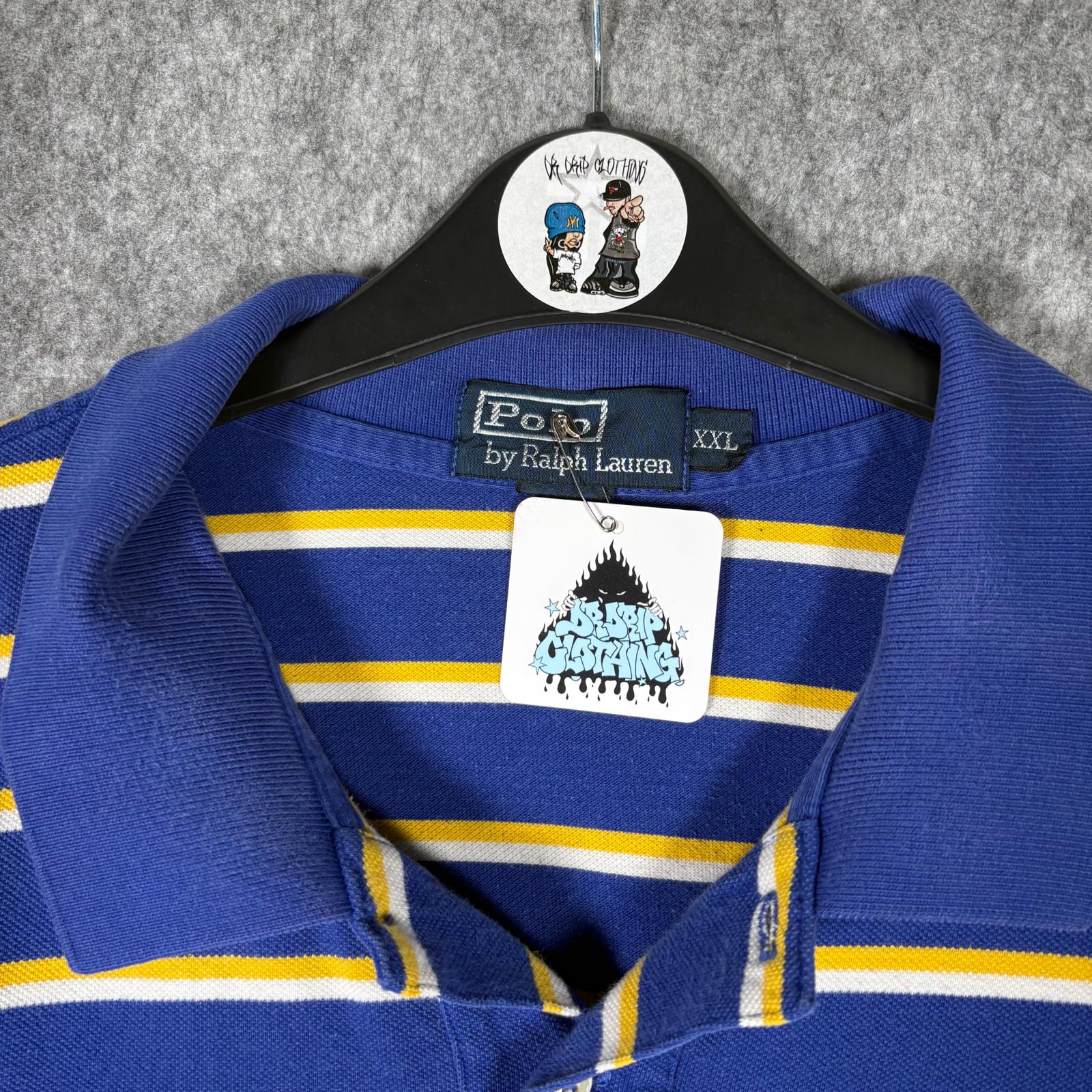 Polo by Ralph Lauren striped short sleeve polo shirt featuring a vibrant royal blue base with yellow and white stripes, finished with the signature red embroidered pony logo. A timeless streetwear staple that pairs perfectly with denim or cargos for that clean 2000s look.