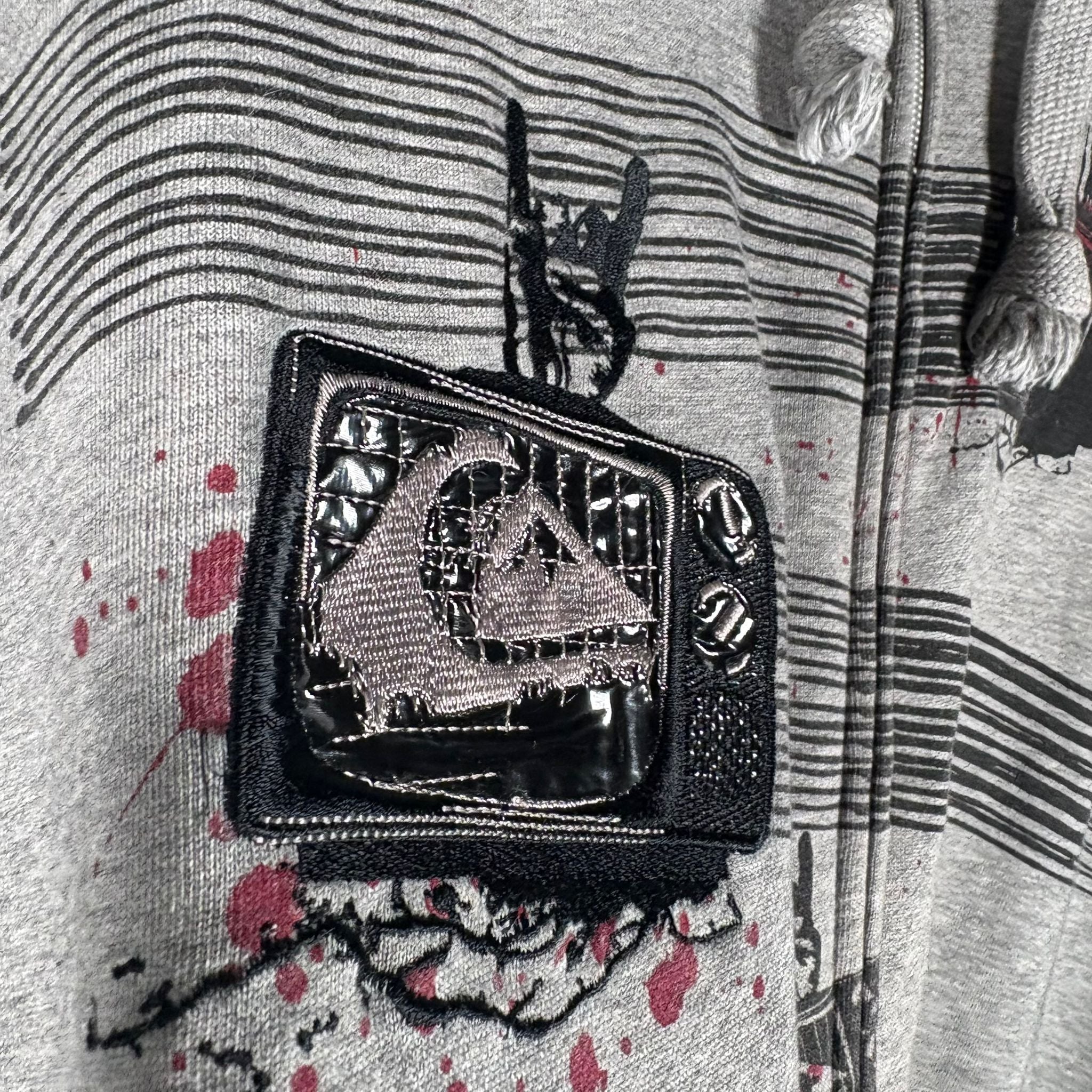 Features embroidered and printed TV graphic with red paint splash detailing.