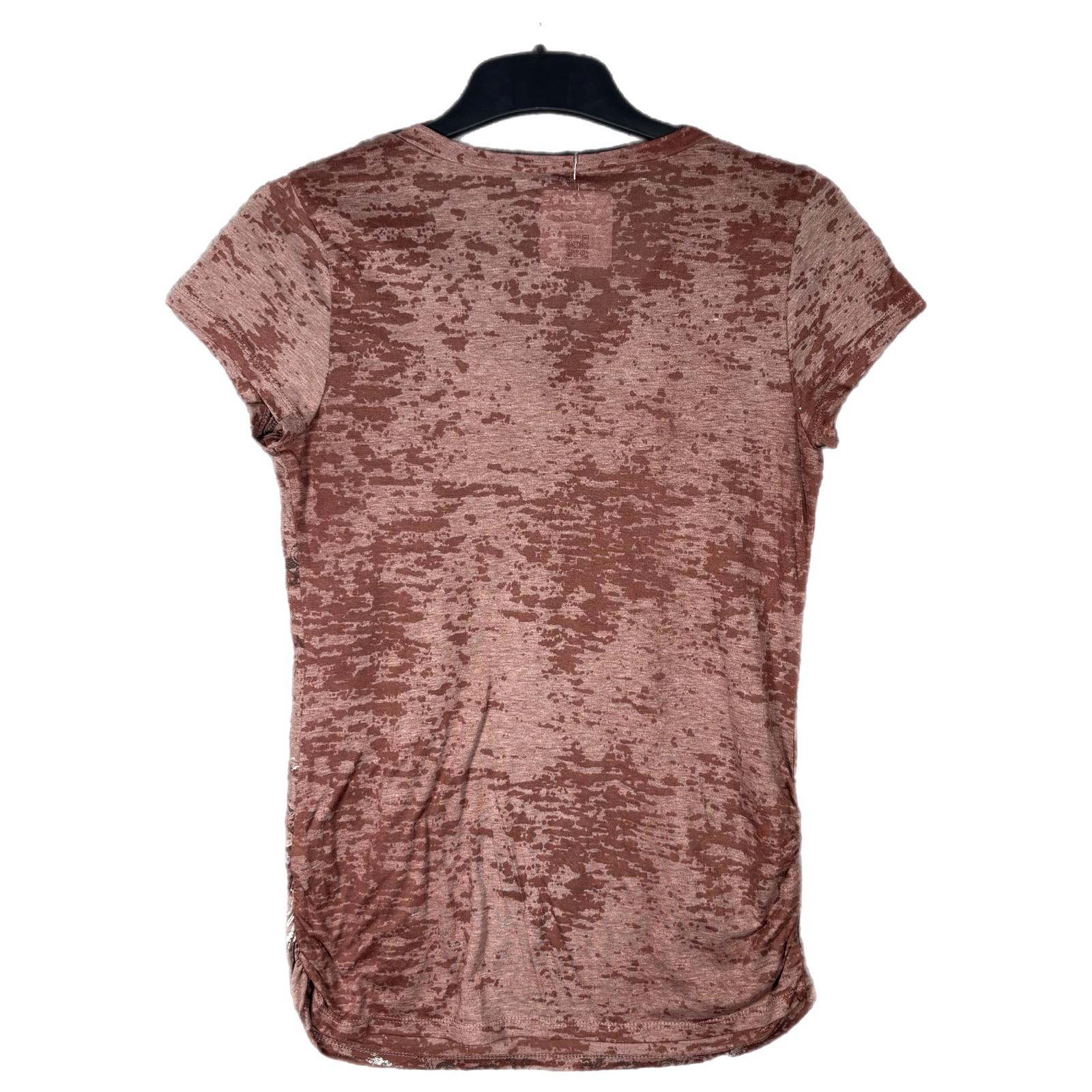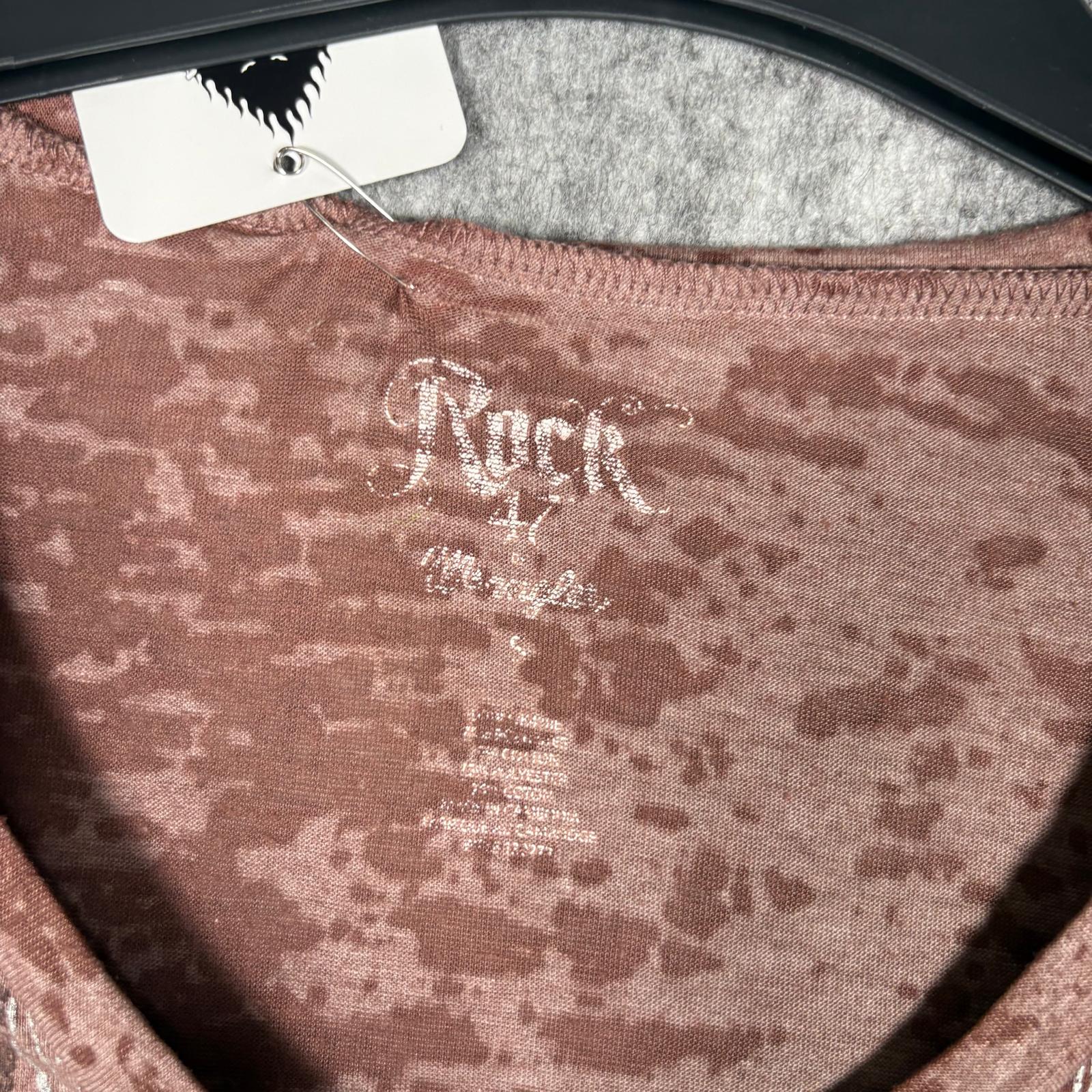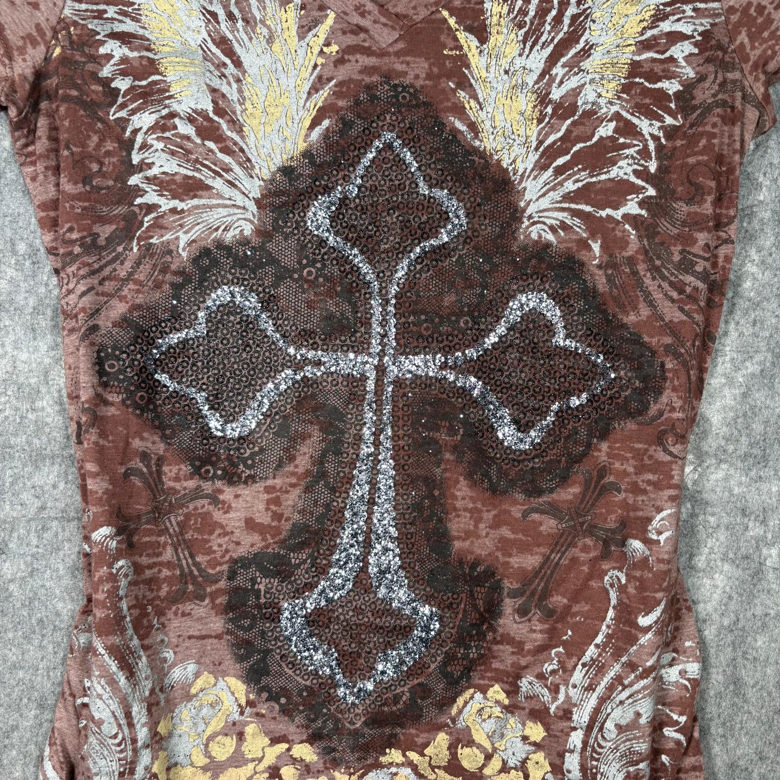Rock 47 by Wrangler brown burnout short sleeve top featuring a large sequin cross with metallic gold and silver embroidered wings. Lightweight stretch fabric with a fitted Y2K silhouette — perfect styled with flared jeans or denim skirts for a western-glam aesthetic.