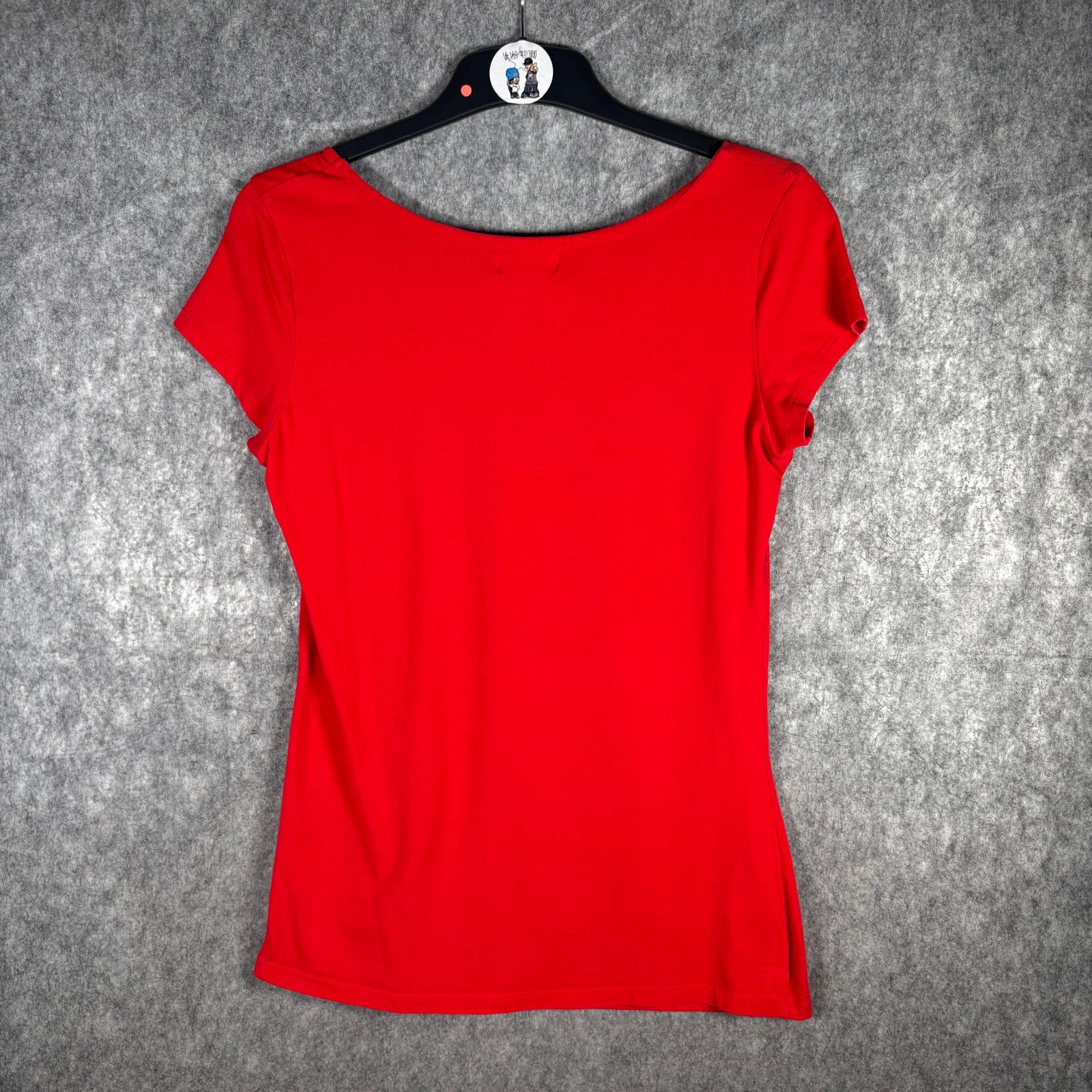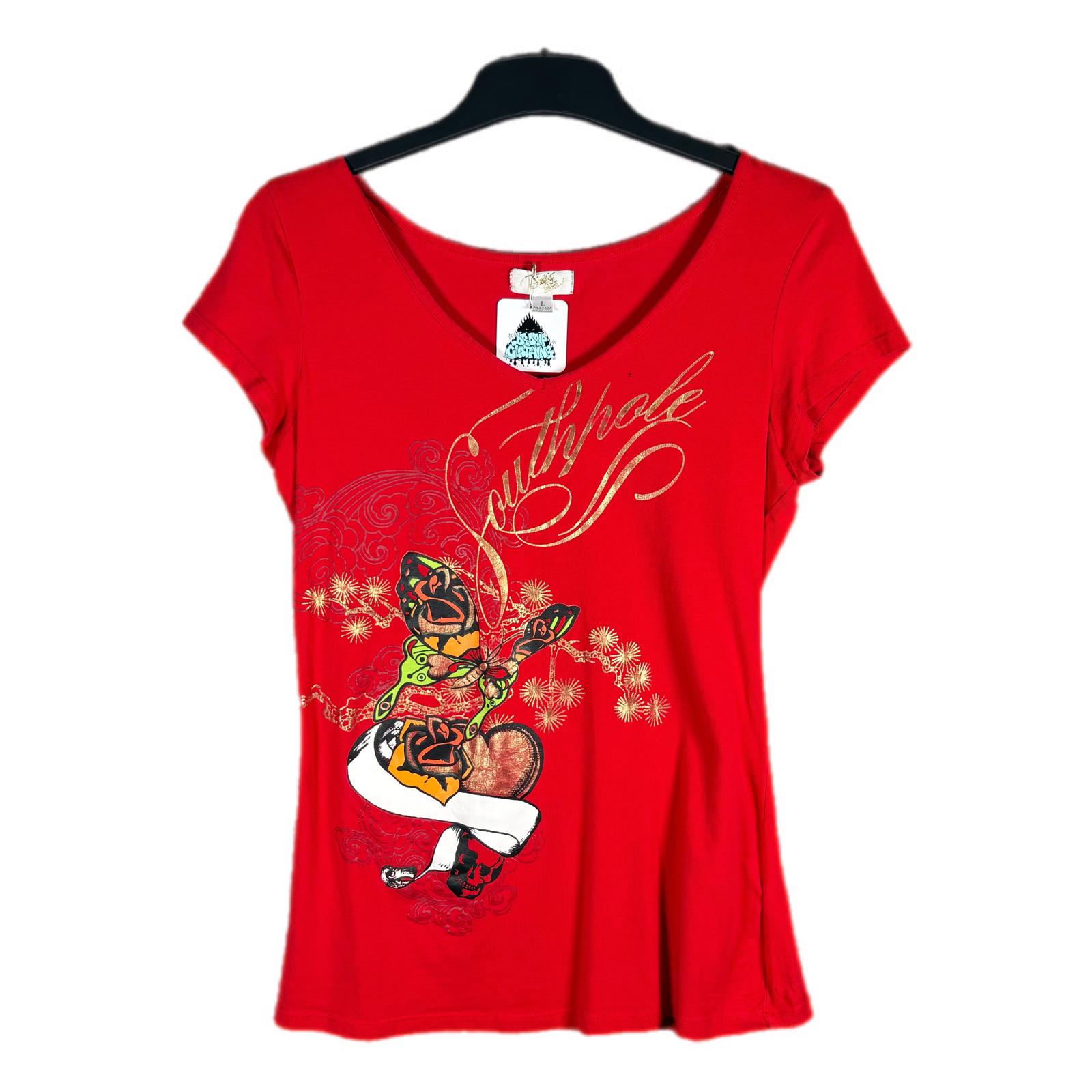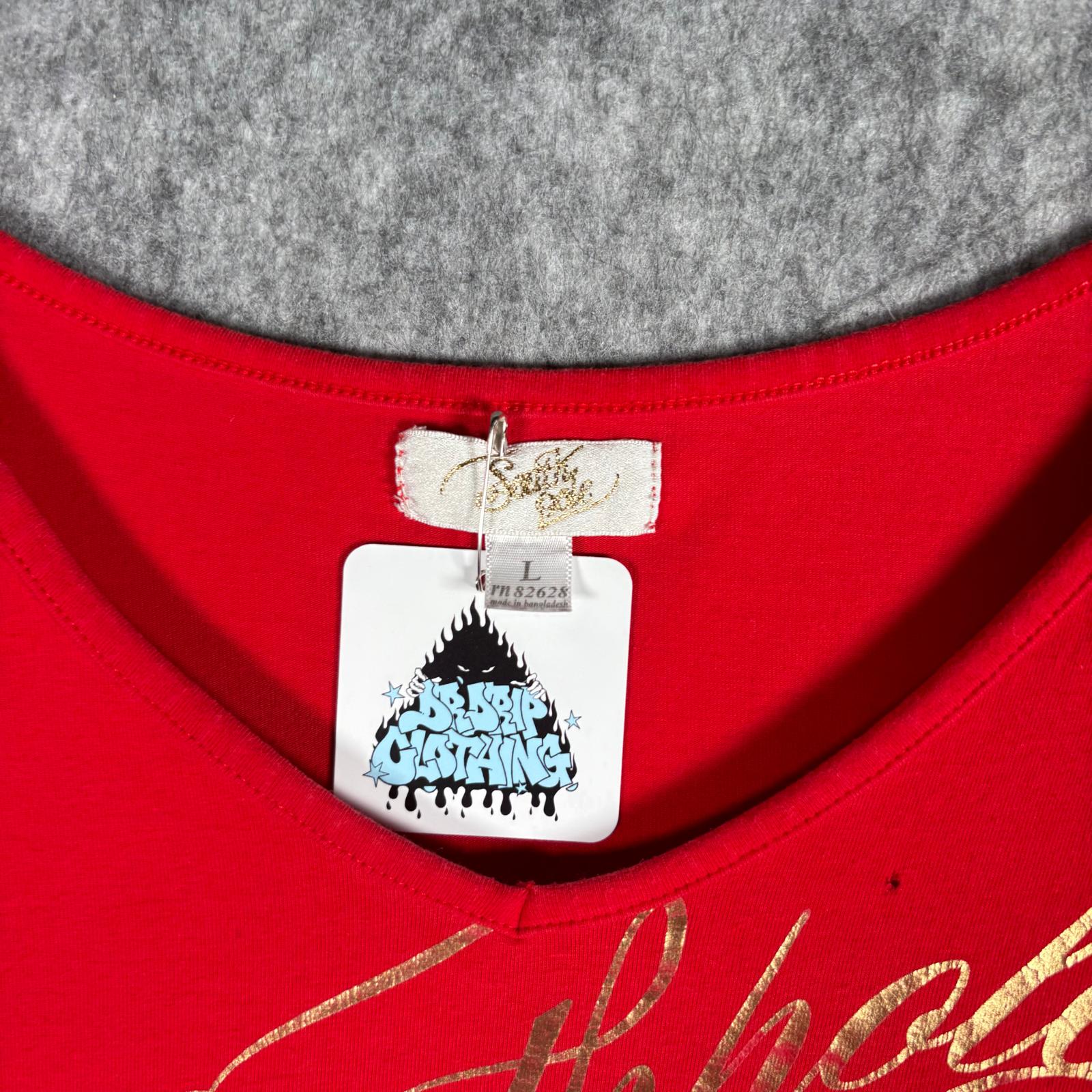 Vintage-style Southpole graphic tee in a bold red colourway, featuring metallic gold script, tattoo-inspired roses and angel motifs. Classic Y2K streetwear energy with a fitted silhouette. Tagged Size L.