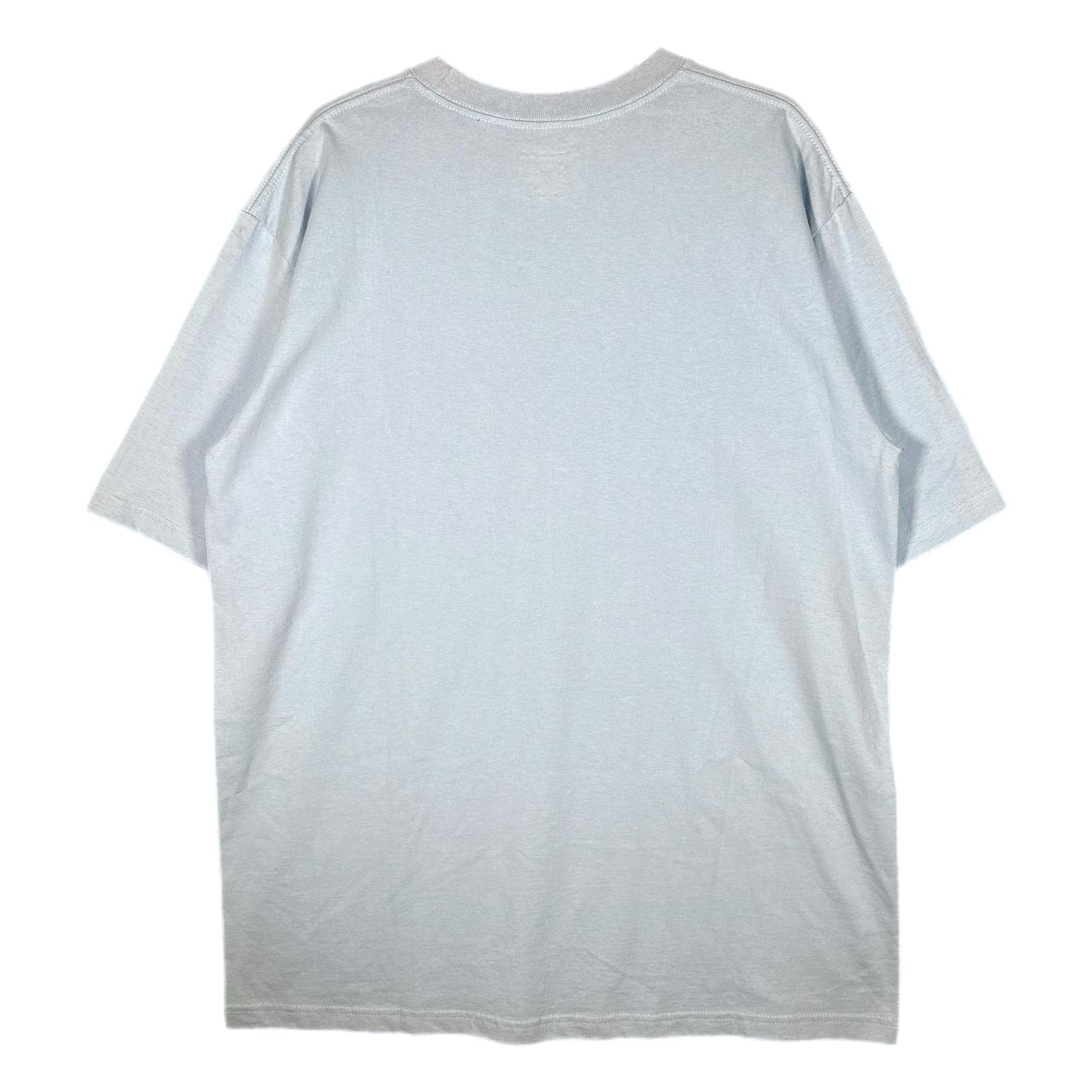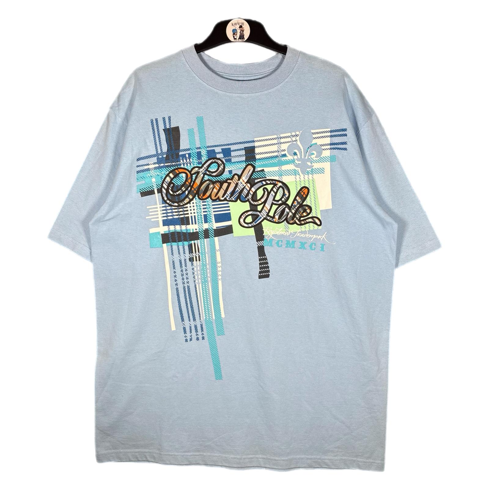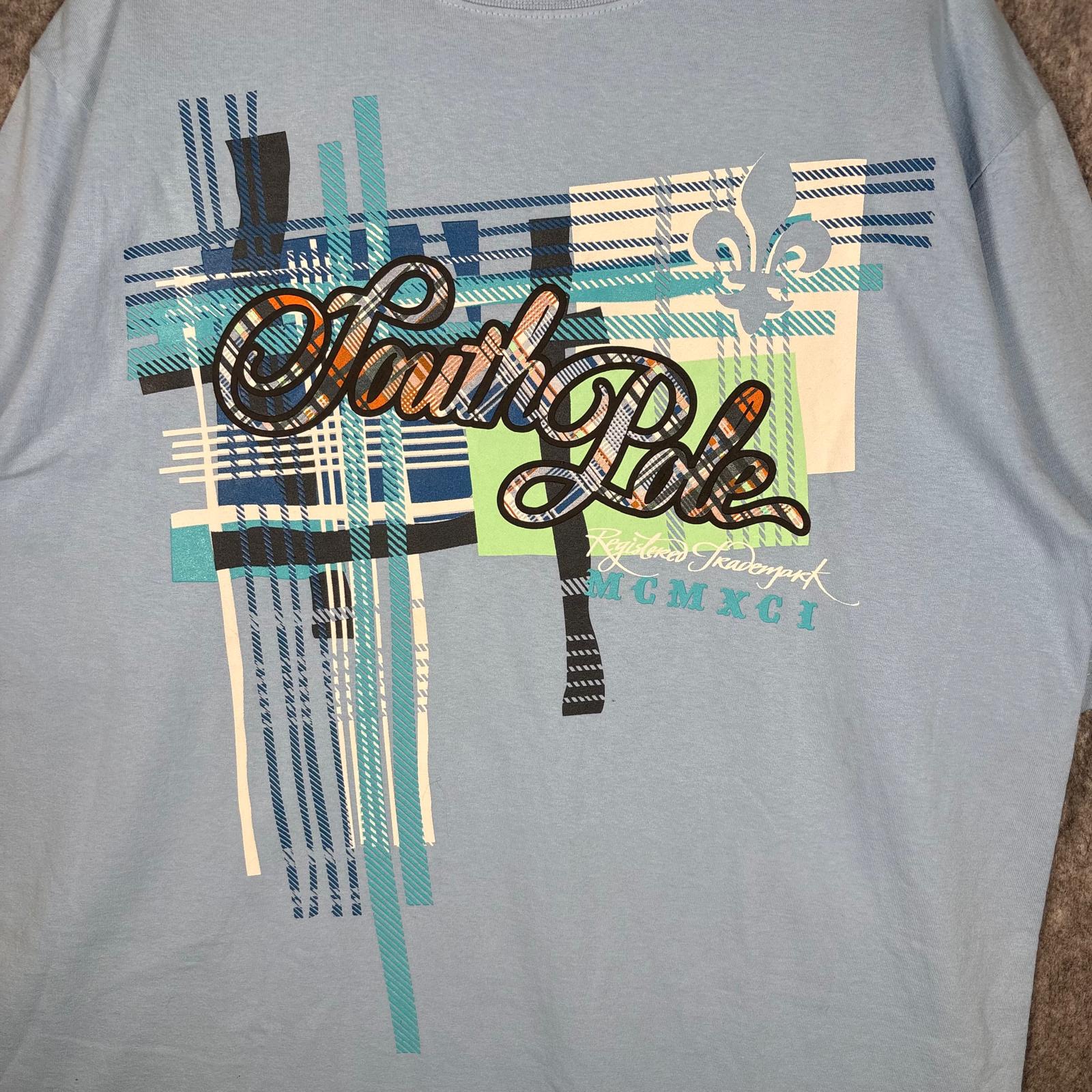 Vintage Southpole Signature Series T-shirt in sky blue featuring a multi-layered plaid graphic and script logo across the chest. This piece is deadstock with original tag still attached, representing a clean example of early 2000s hip-hop fashion from one of the era’s most iconic streetwear brands.