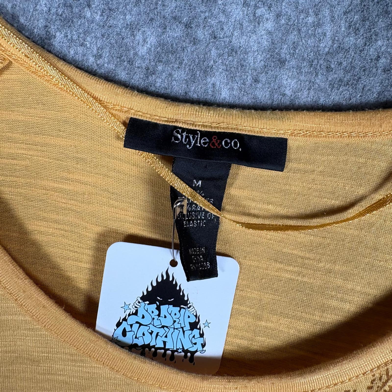 Vibrant Style & Co yellow graphic top featuring a detailed paisley and mandala-style print with subtle rhinestone accents. Soft, lightweight fabric with ruched cap sleeves and a flattering scoop neckline. Boho aesthetic with a fitted yet comfortable silhouette.