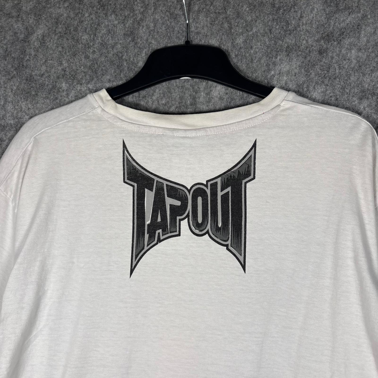 Authentic Tapout T-shirt in white featuring a bold American flag eagle graphic and contrasting red neckline trim. A classic piece from the brand’s MMA-inspired era, known for its striking distressed prints and fightwear aesthetic. Lightweight cotton with a loose, comfortable fit typical of early 2000s Tapout designs.