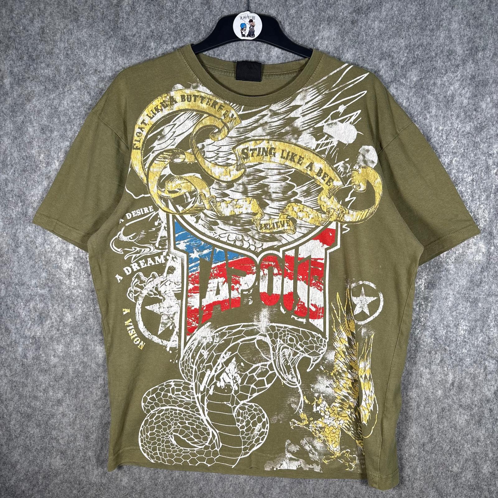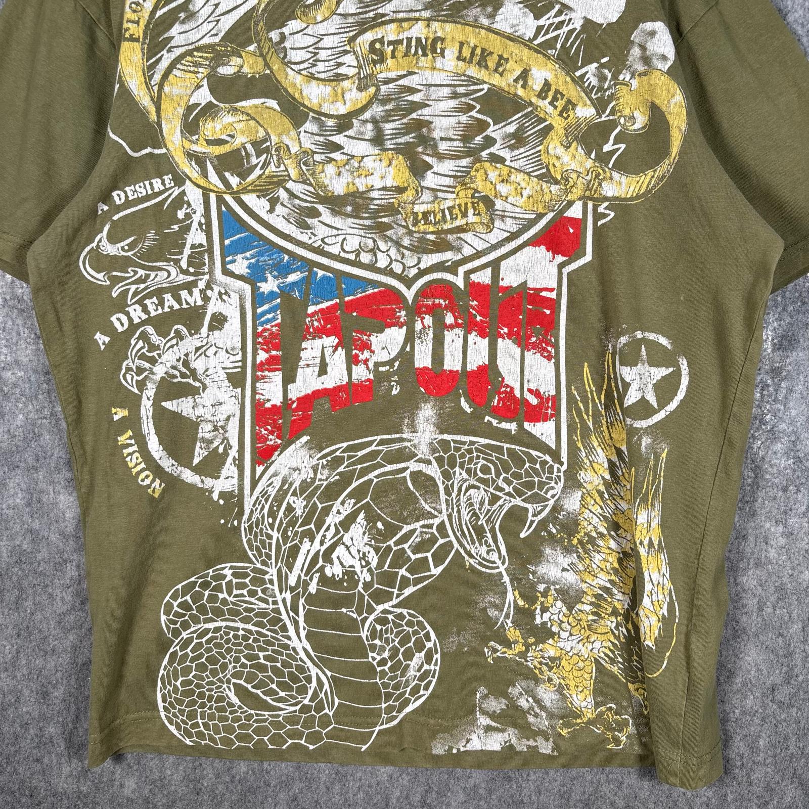 Vintage Tapout graphic tee in olive green featuring a large snake and winged design with distressed USA flag detailing. Includes bold Tapout branding and “Float Like a Butterfly, Sting Like a Bee” slogan inspired by MMA culture. Thick cotton construction with a classic Y2K fit and naturally aged graphic.