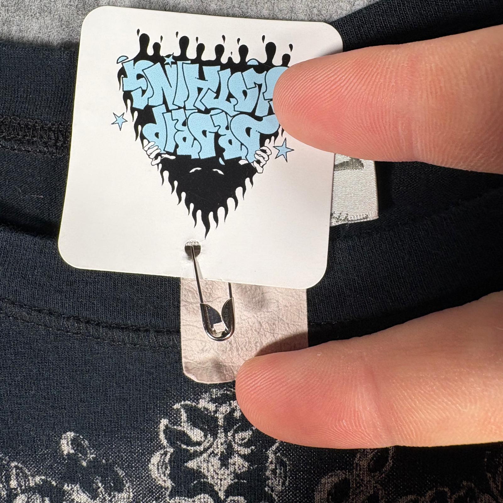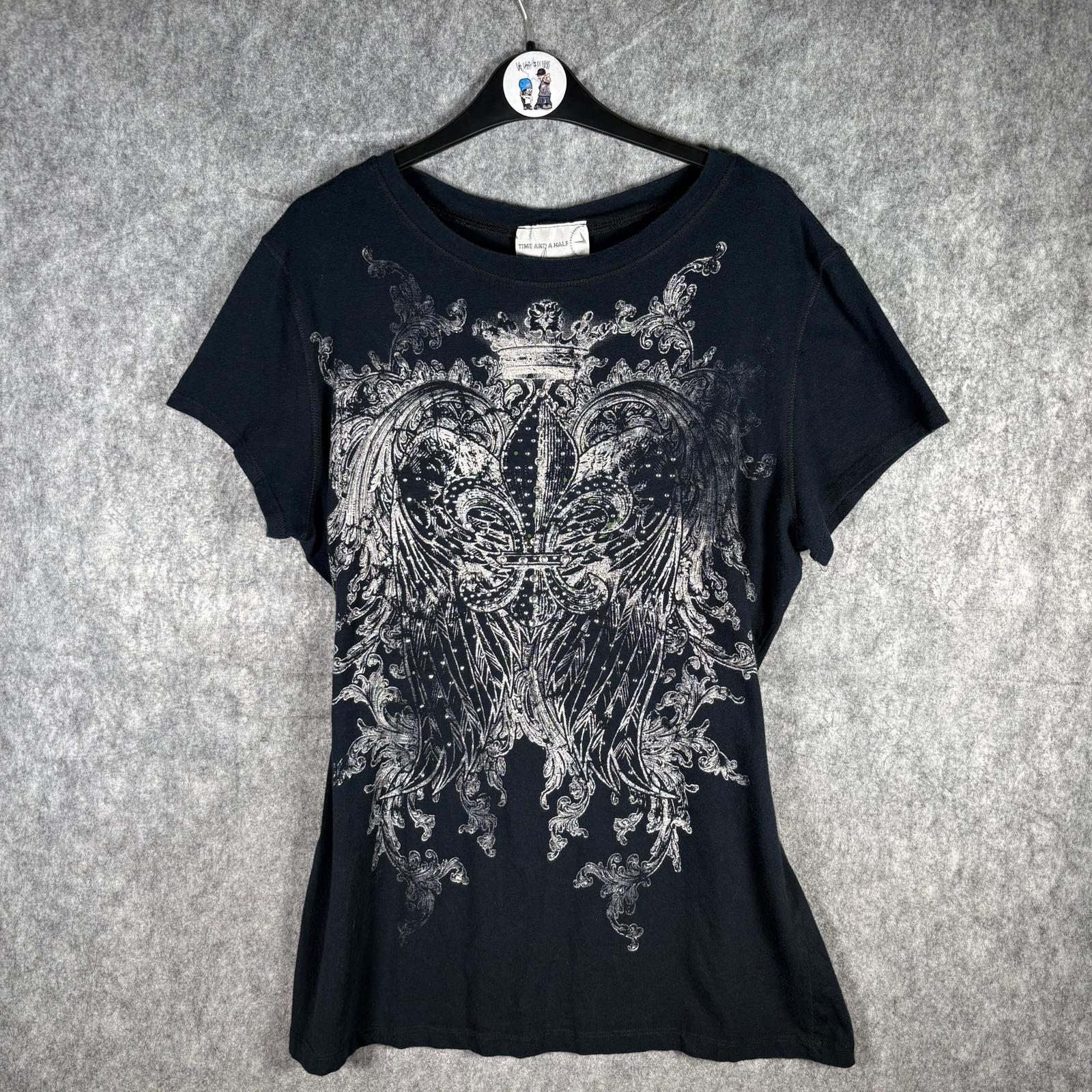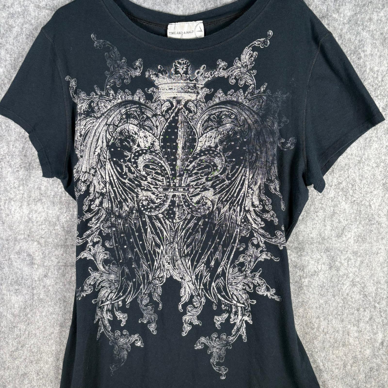 Time & A Half produced detailed graphic tees in the early 2000s, often featuring rhinestones, metallic ink and symmetrical gothic motifs—perfect for fans of Affliction, Daytrip, Roar, Rock Revival and the glam-rock aesthetic.