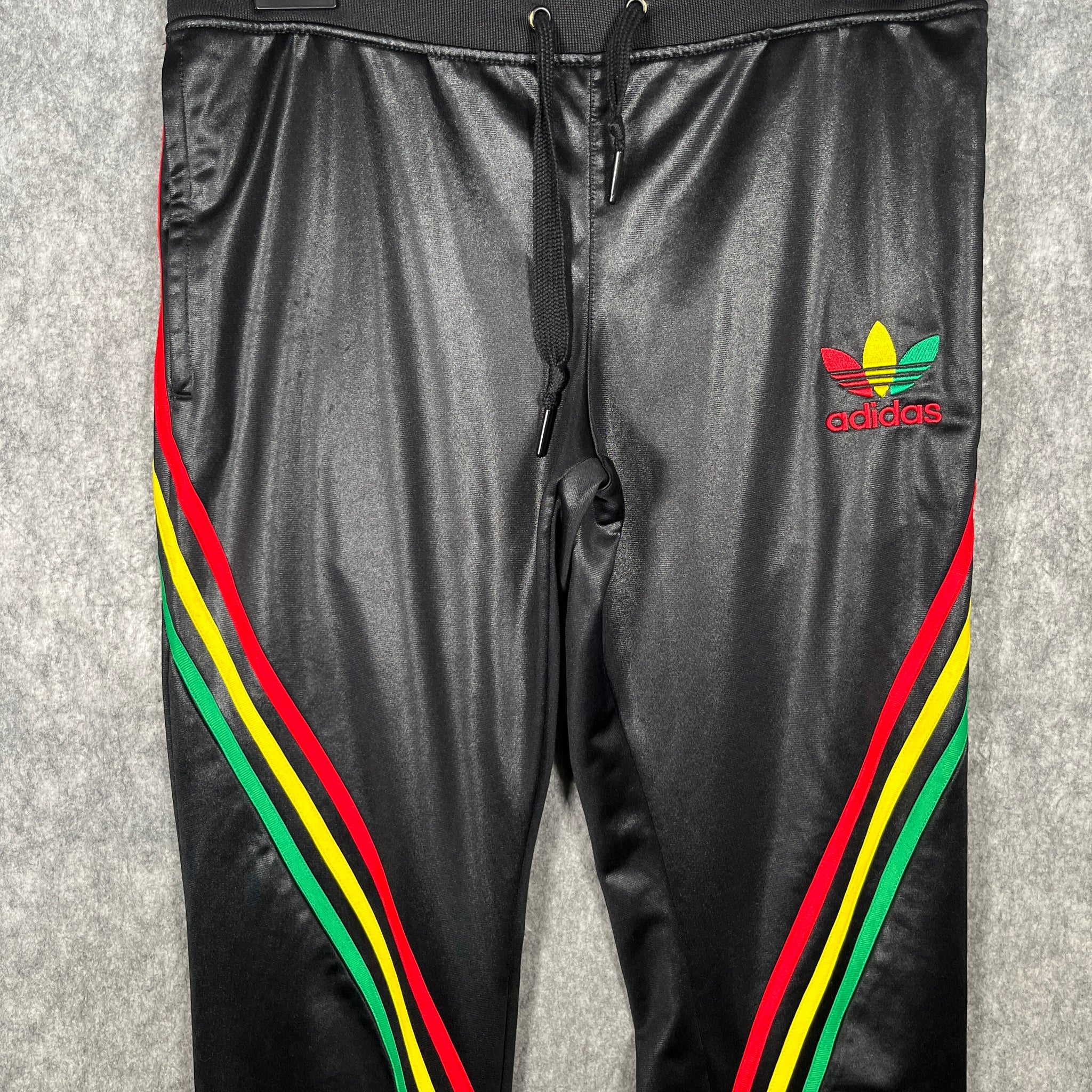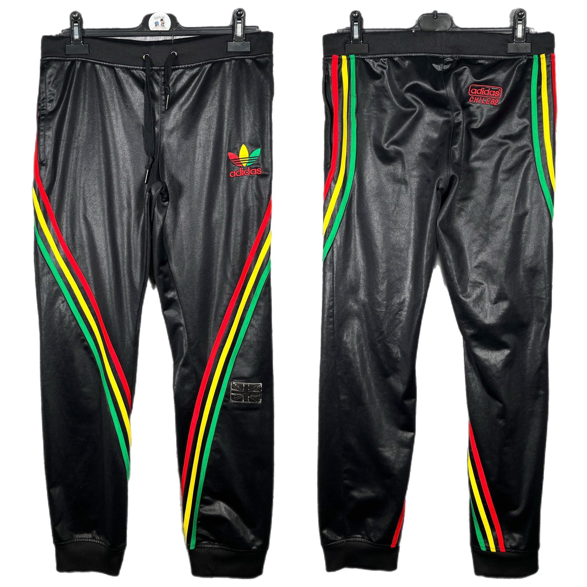 Authentic vintage Adidas joggers in a standout Rasta colourway — black with red, yellow and green stripes. Classic Adidas Originals vibe with a bold reggae aesthetic that’s trending right now. Great piece for streetwear fans, collectors or anyone wanting something unique in their wardrobe. Message for measurements if required :)