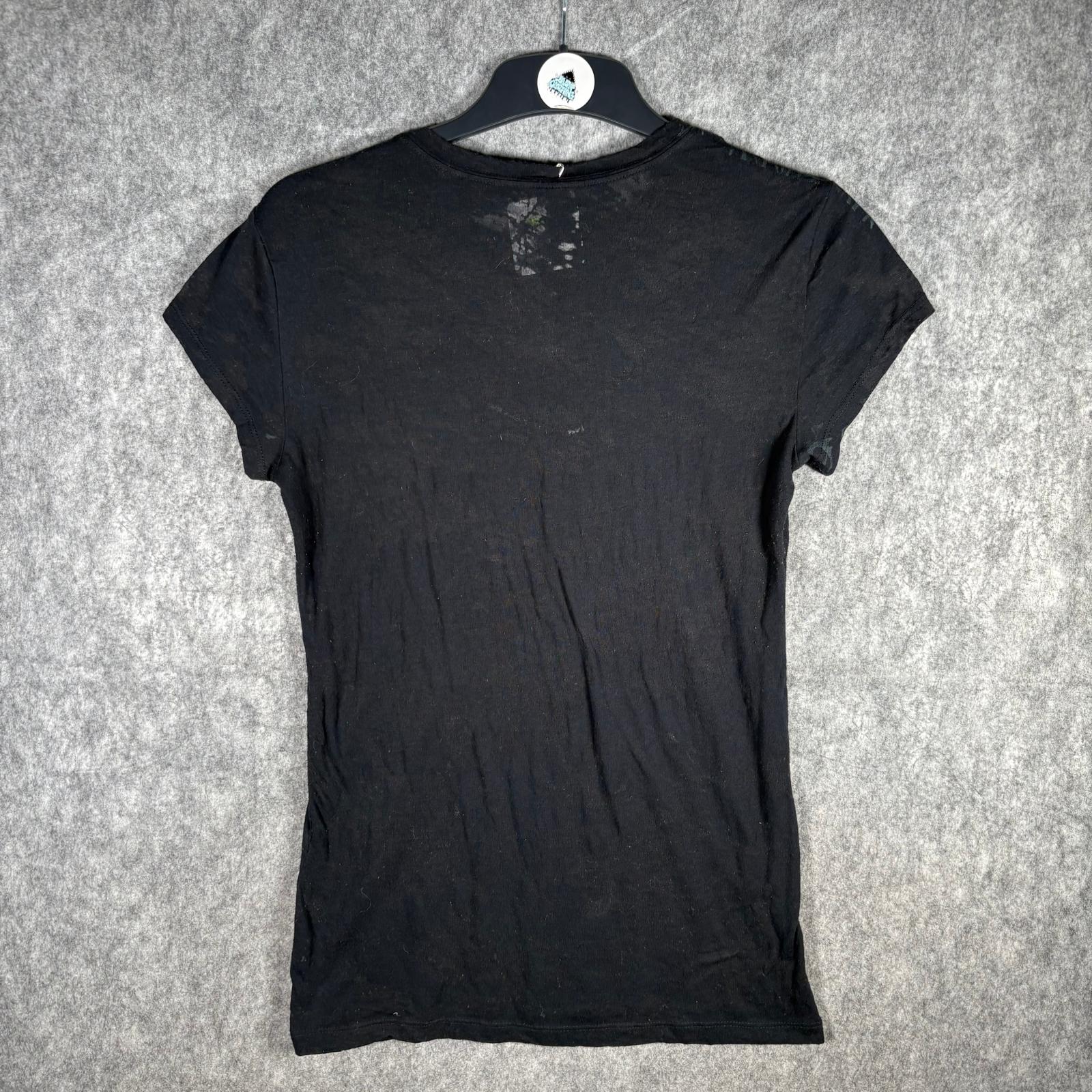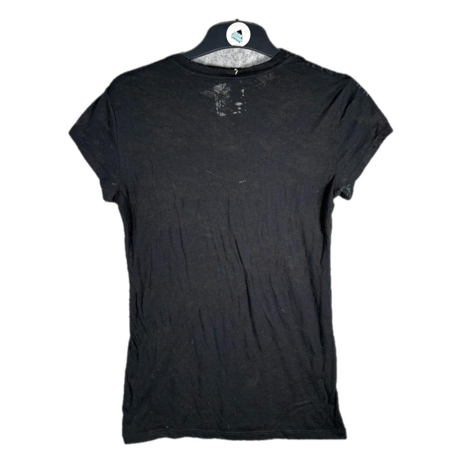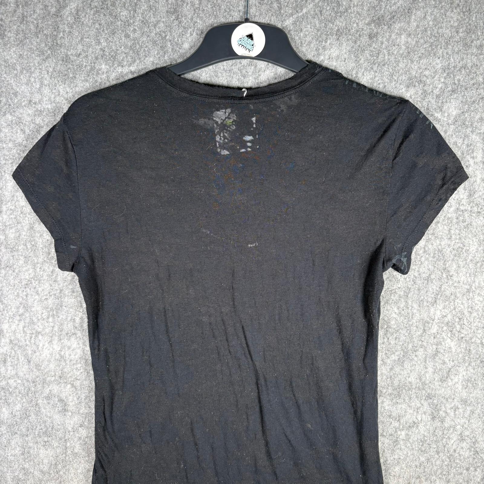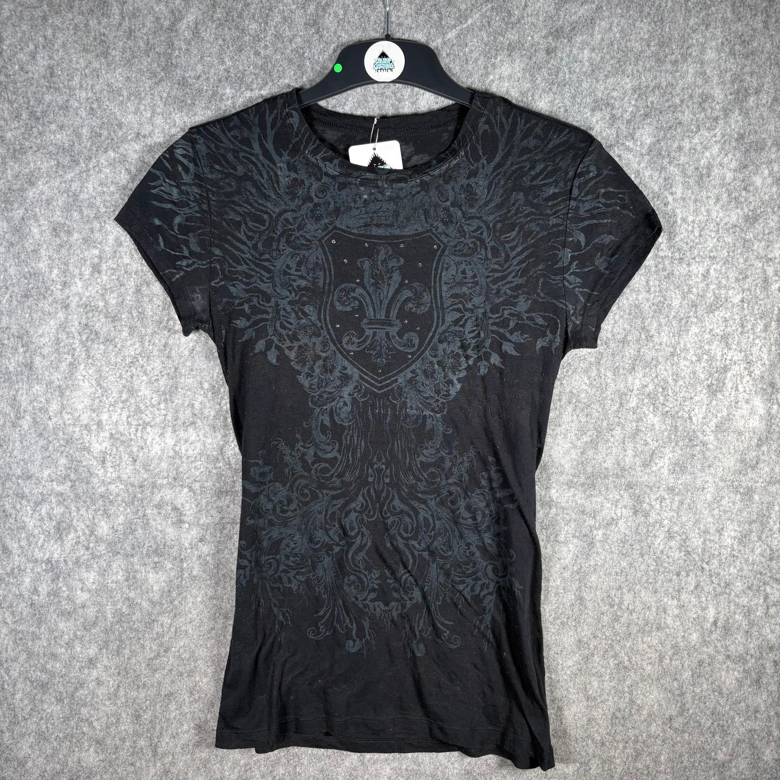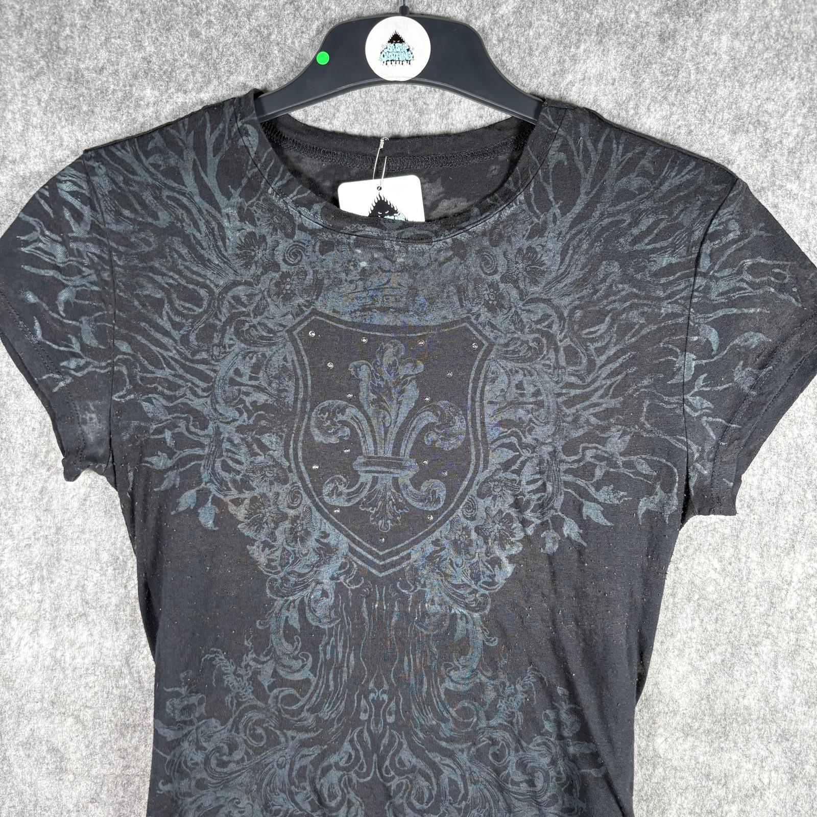 Y2K burnout gothic graphic tee with crest and fleur-de-lis shield print in washed black. Semi-sheer distressed cotton blend with a fitted silhouette, similar in style to early Affliction and Rock & Republic era tops. No visible brand tag but high-quality print and fabric.