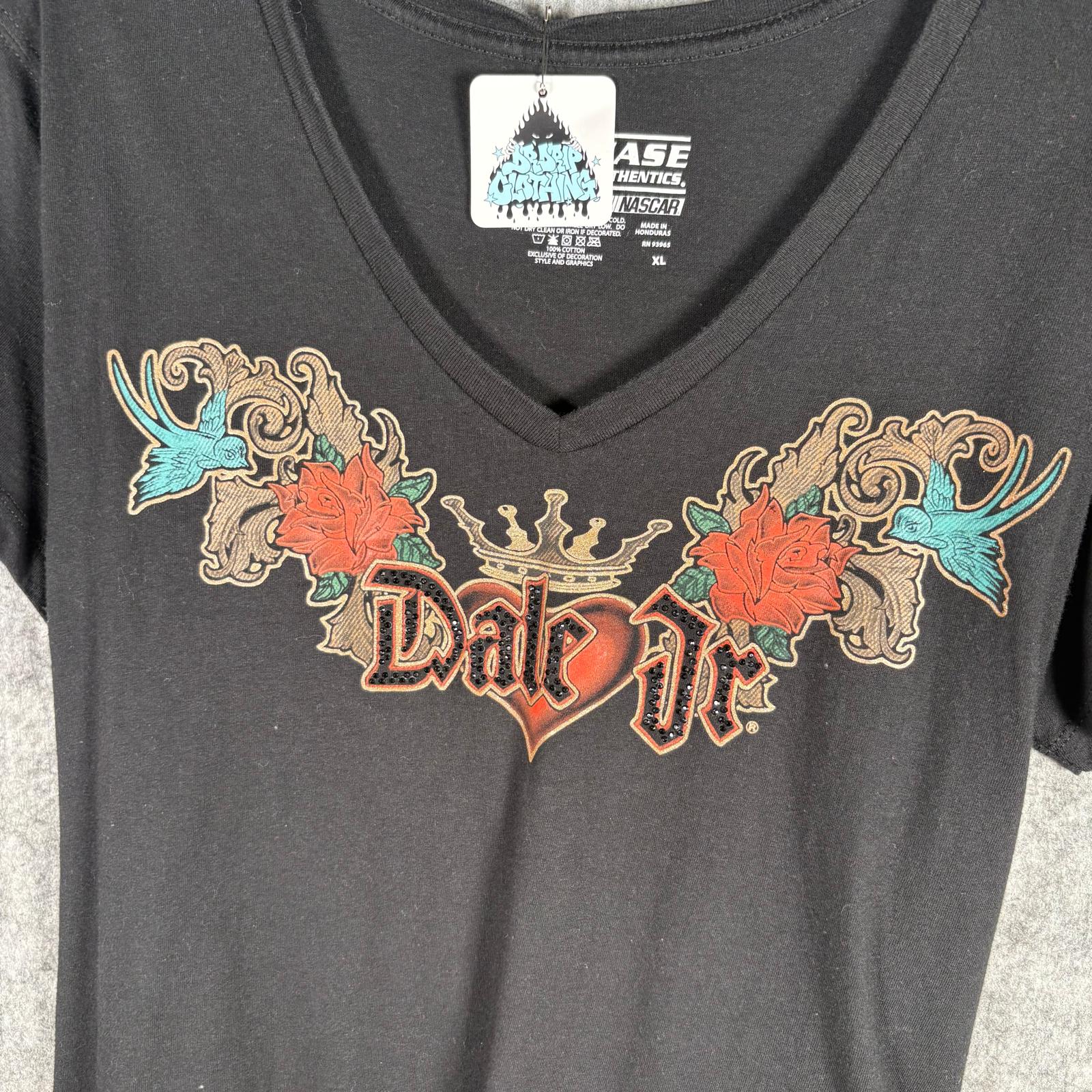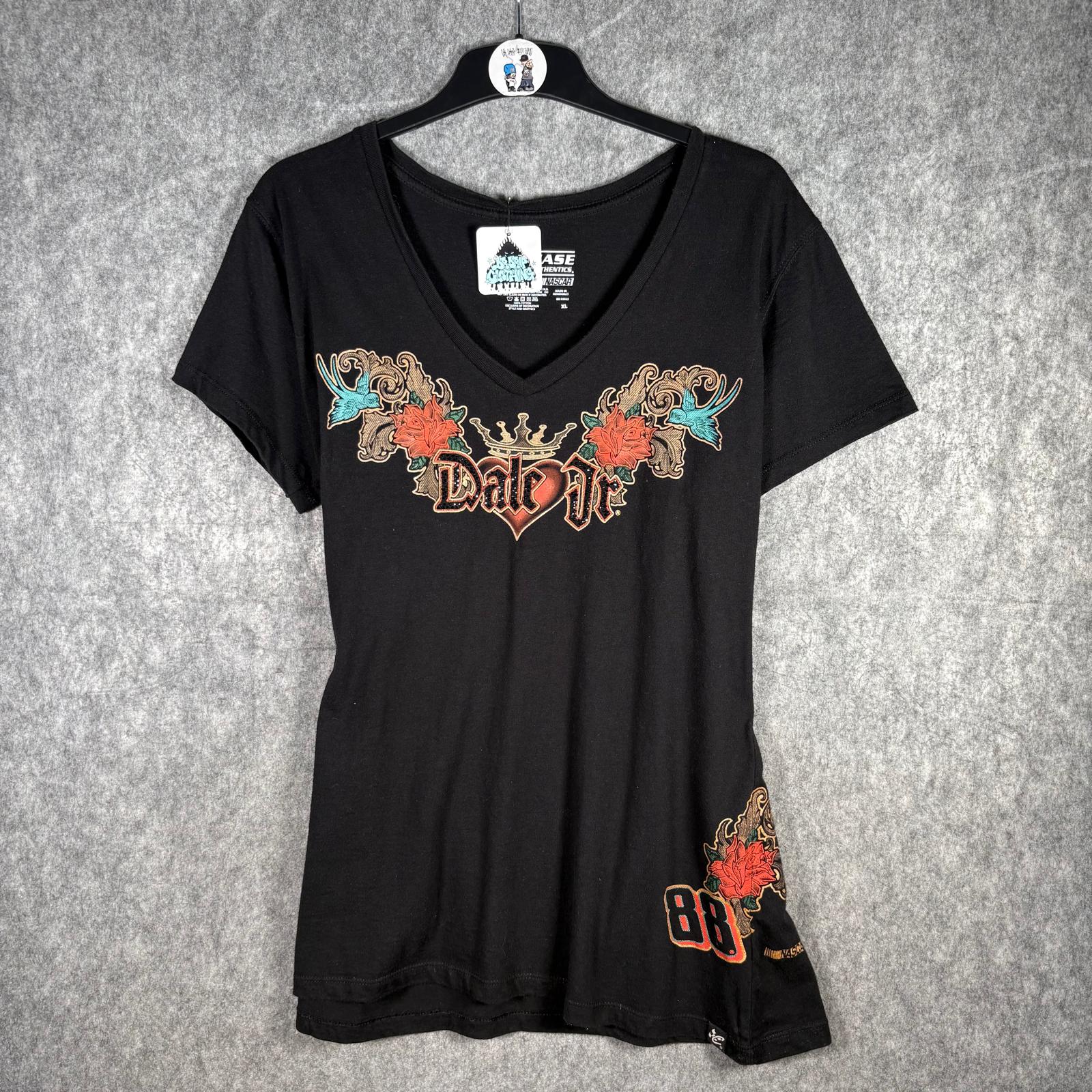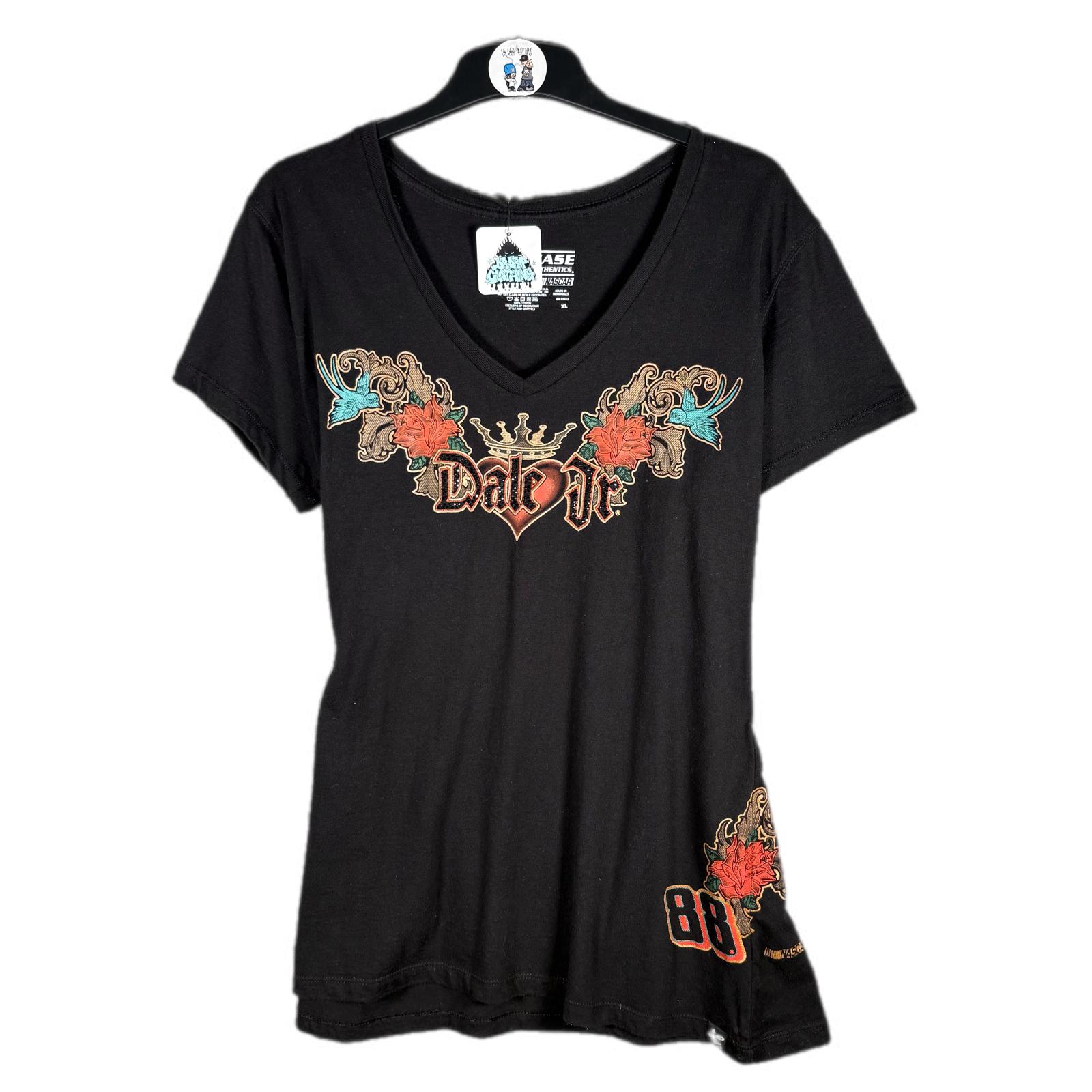 Bold NASCAR energy with a Y2K twist — this HASE Official Dale Jr tee comes in a deep black cotton with a detailed front graphic featuring roses, swallows, a crowned heart and the number 88. Soft, lightweight and perfect for anyone who loves racing merch with an Americana/rockwear feel.
