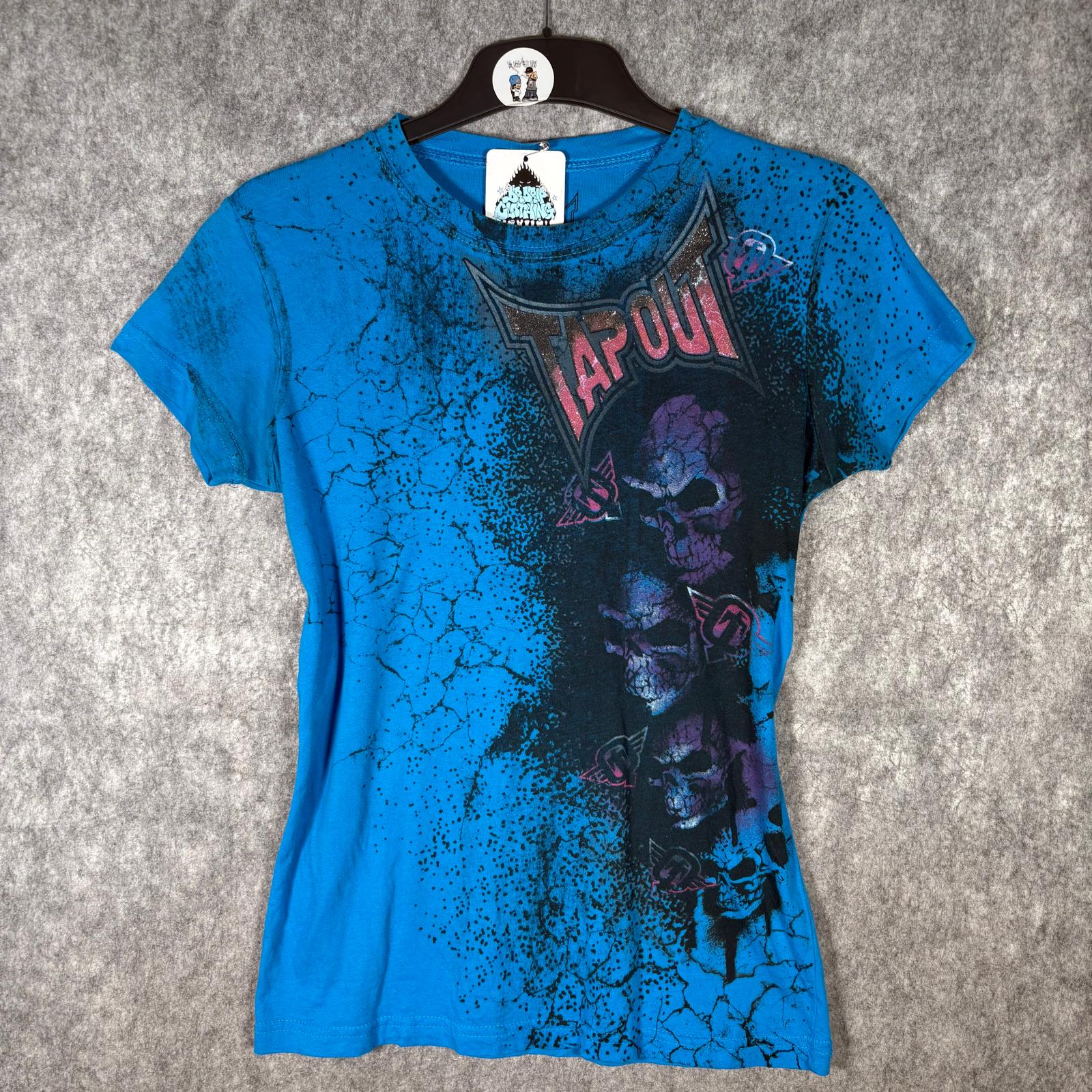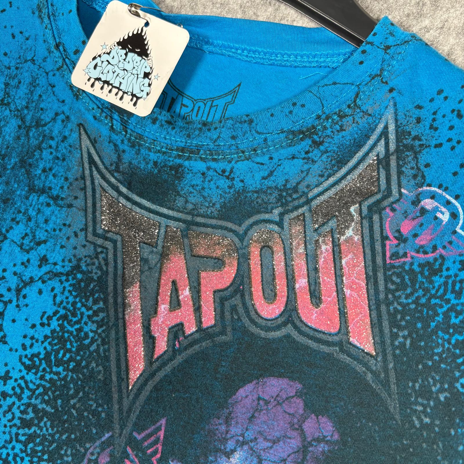 Tapout bright blue MMA-style t-shirt featuring distressed skull graphics and the classic Tapout logo on the front and back. Early 2000s fightwear energy with a bold Y2K edge. Slight marks on the back as shown in photos — reflected in price.