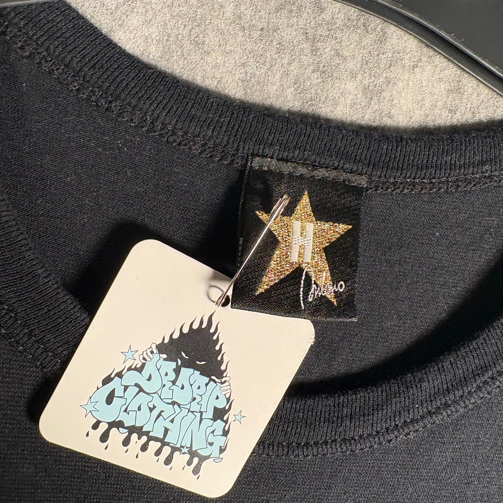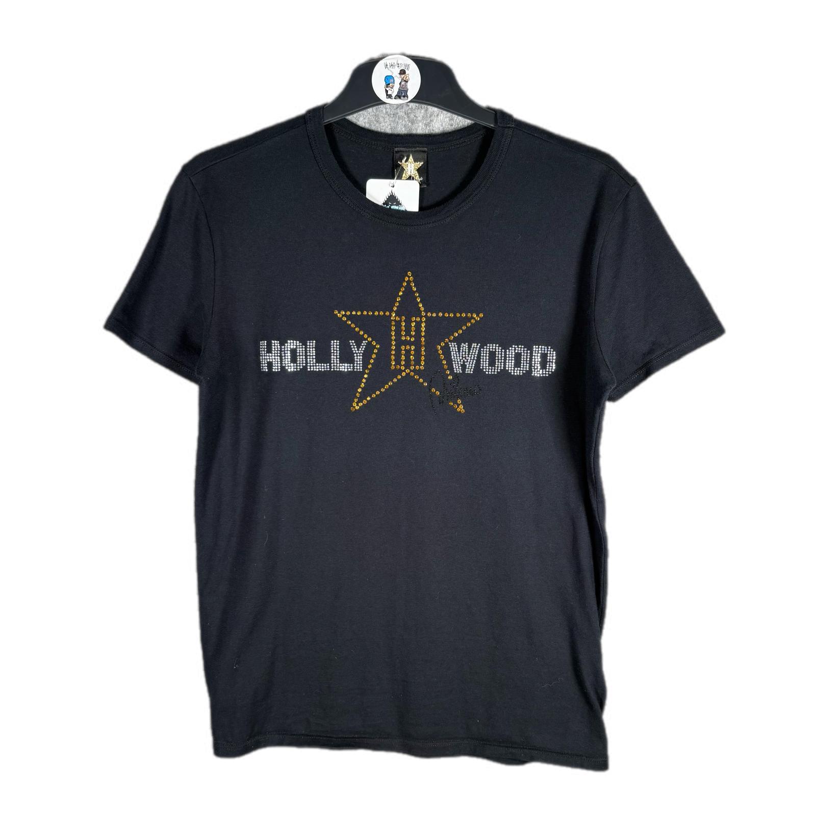 Y2K-era black tee with full rhinestone “Hollywood” star graphic in gold and silver. Classic 2000s bling aesthetic — looks like something straight out of early MTV red carpet fits. Unknown brand but high quality cotton and clean finish.